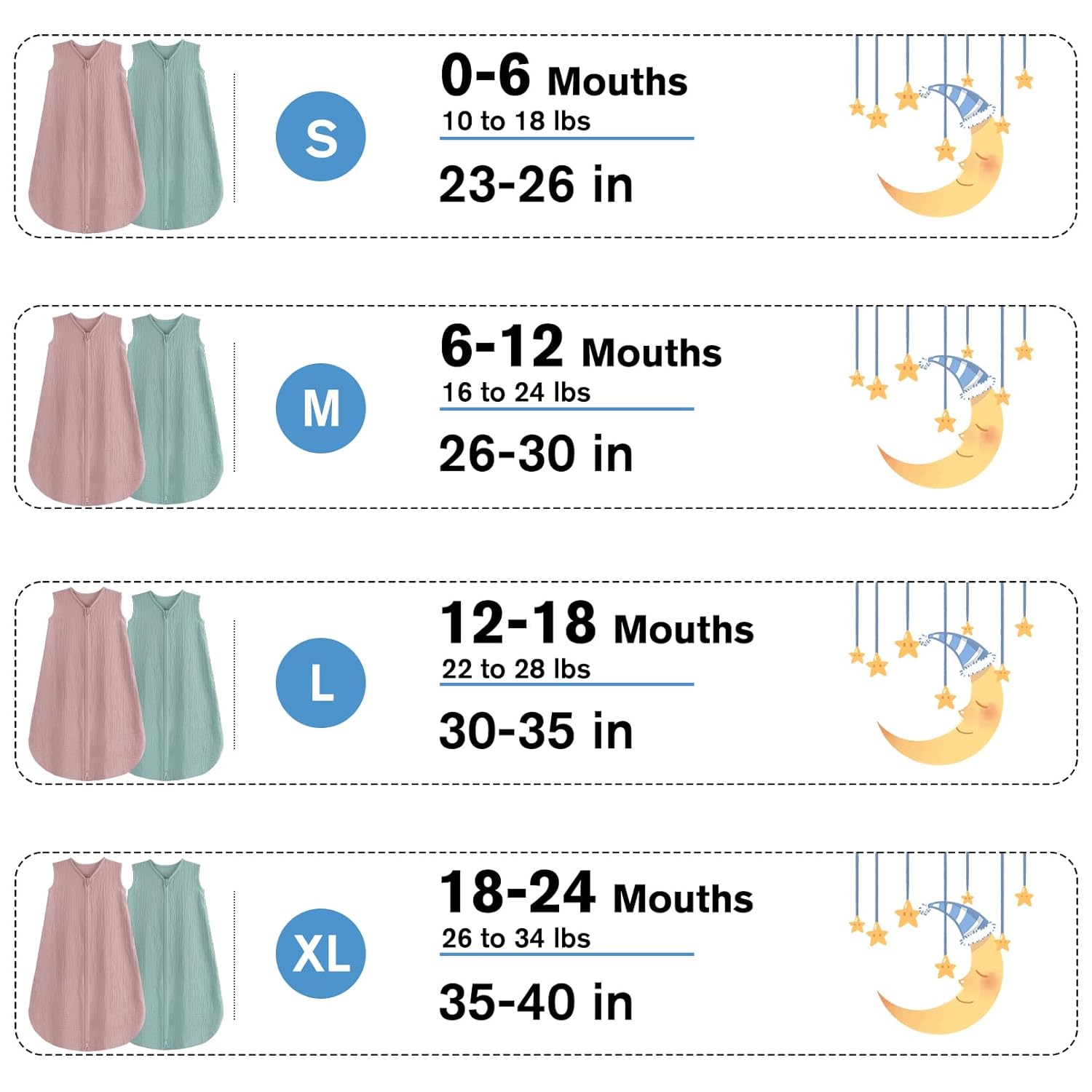 Designed with your baby's comfort in mind, these 2 Pack Baby Sleep Sacks are made from 100% organic cotton muslin, offering a soft and gentle touch that's perfect for delicate baby skin. Their lightweight and breathable design helps keep your little one cool and comfortable throughout the night, ensuring a restful sleep without the risk of overheating.