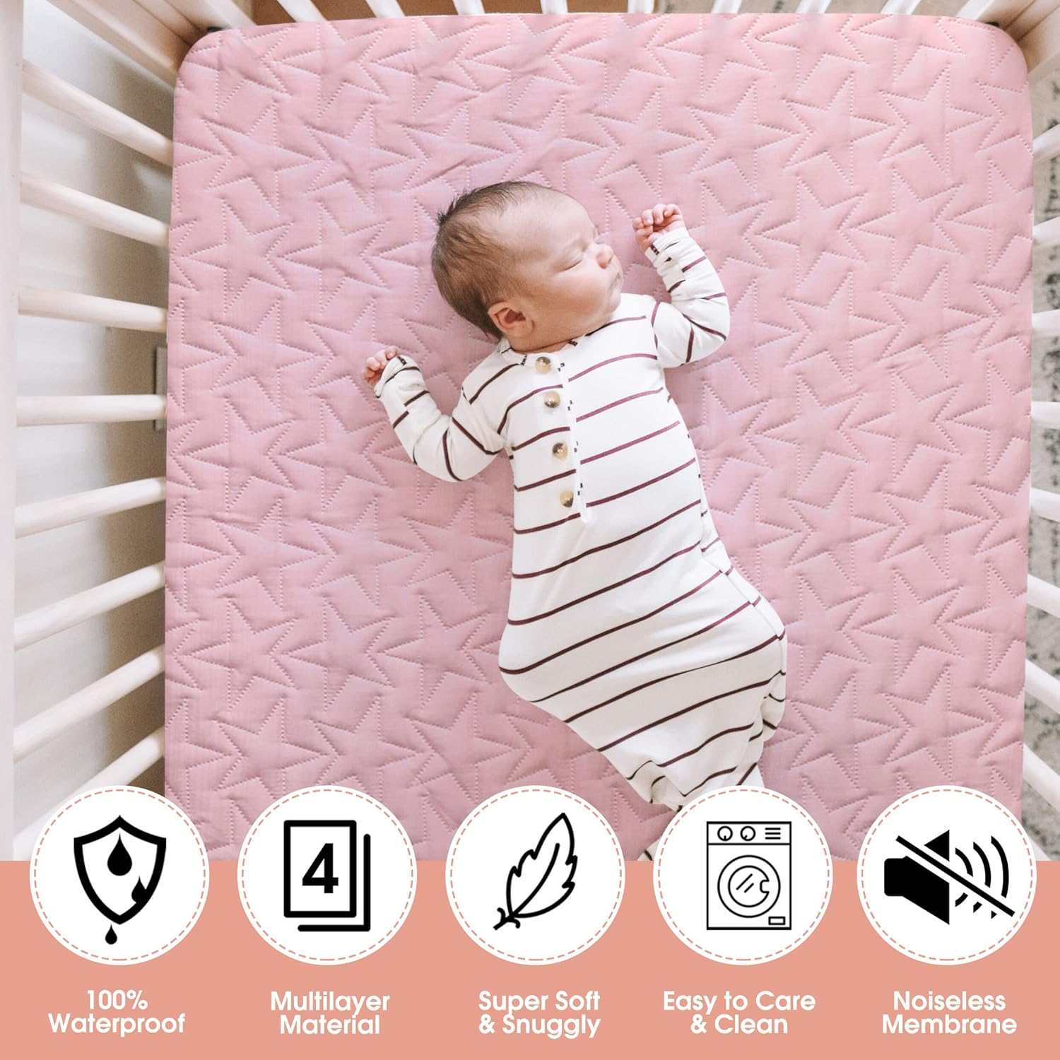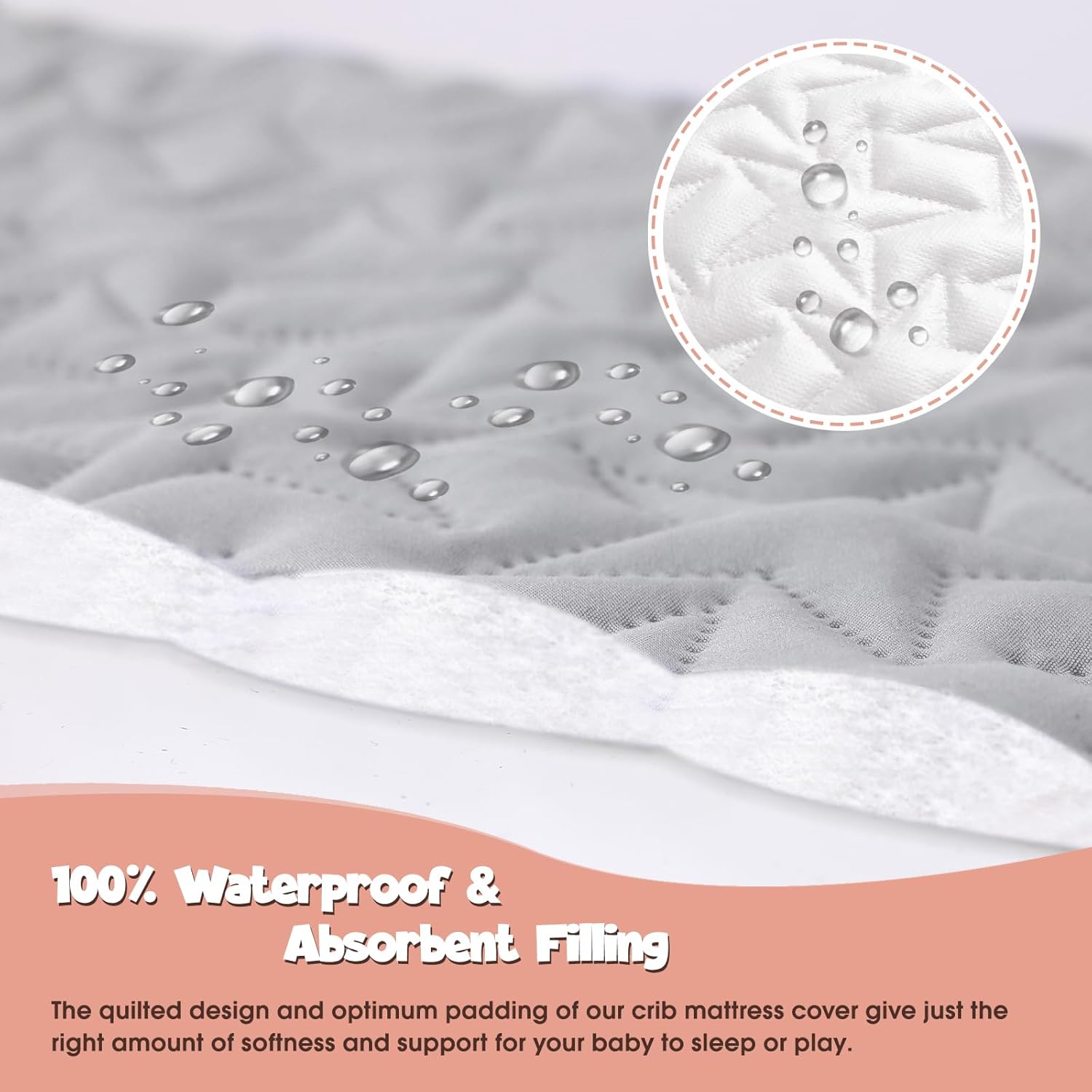 Designed for modern parents, our ACRABROS waterproof crib mattress protector offers unmatched comfort and reliability. With a 4-layer build, it provides a soft microfiber surface for gentle contact, a cozy polyester filling for warmth, a waterproof TPU film to shield against spills and leaks, and a breathable knit fabric to ensure your baby stays cool and comfortable throughout the night.