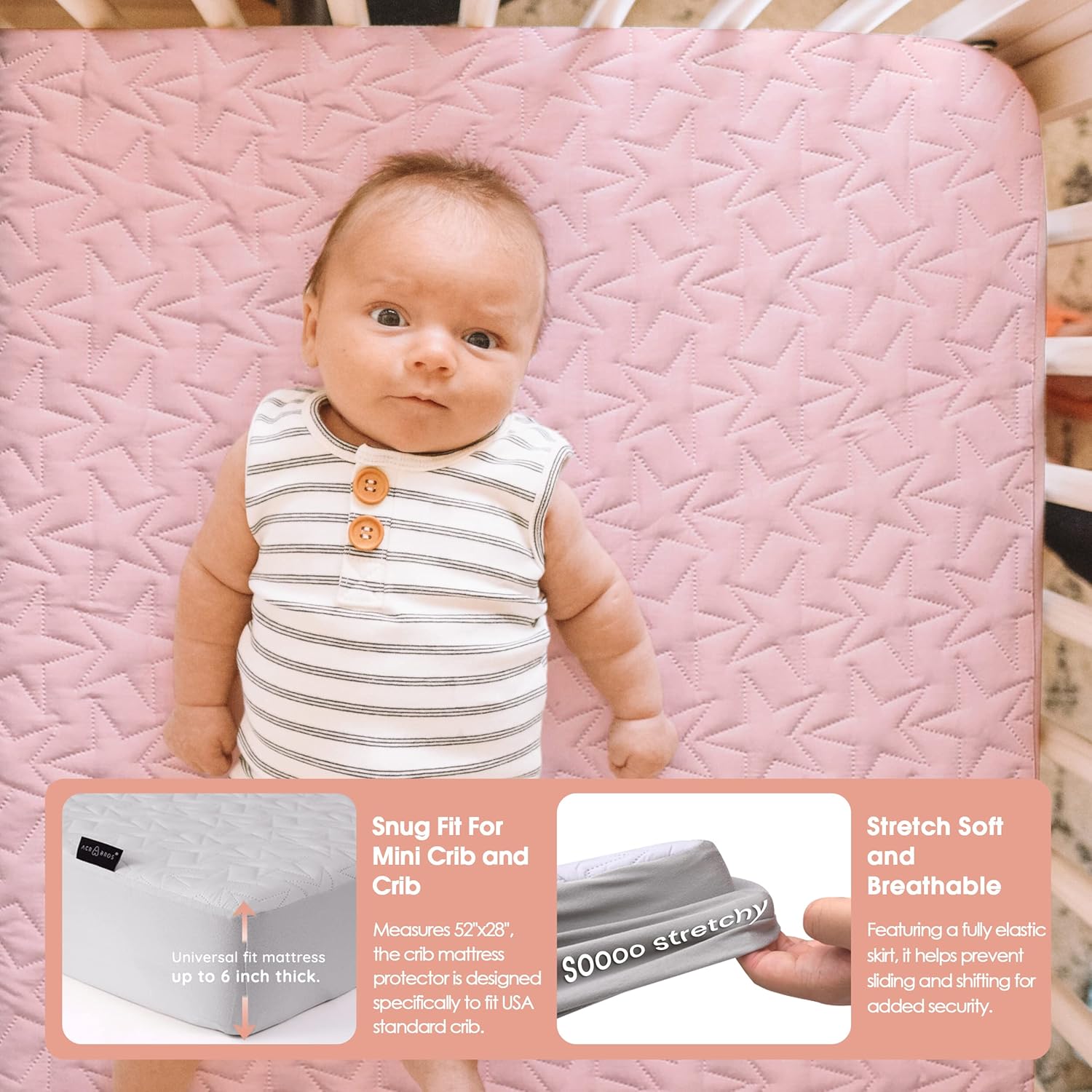 Featuring deep pockets that stretch up to 6 inches, this protector fits snugly on standard crib mattresses and stays in place without slipping or bunching. The elastic edges guarantee a perfect fit, while the premium materials make it easy to clean and built for long-term use.