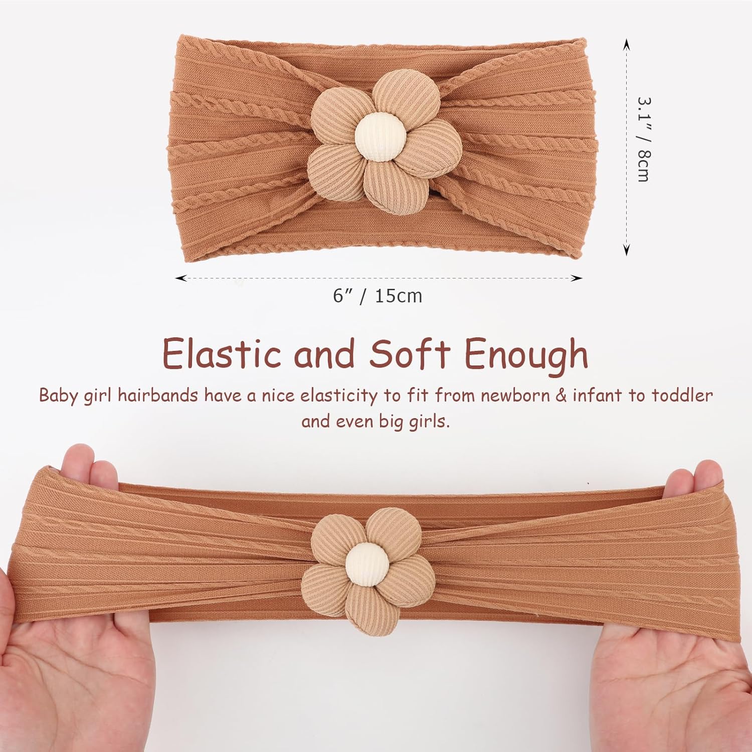 Each headband features a creatively crafted floral pattern that accentuates your baby's natural beauty. Made from a soft blend of 65% high-quality nylon and 35% spandex, they offer a flexible and comfortable fit that adapts to your baby's head shape while maintaining durability for daily wear.