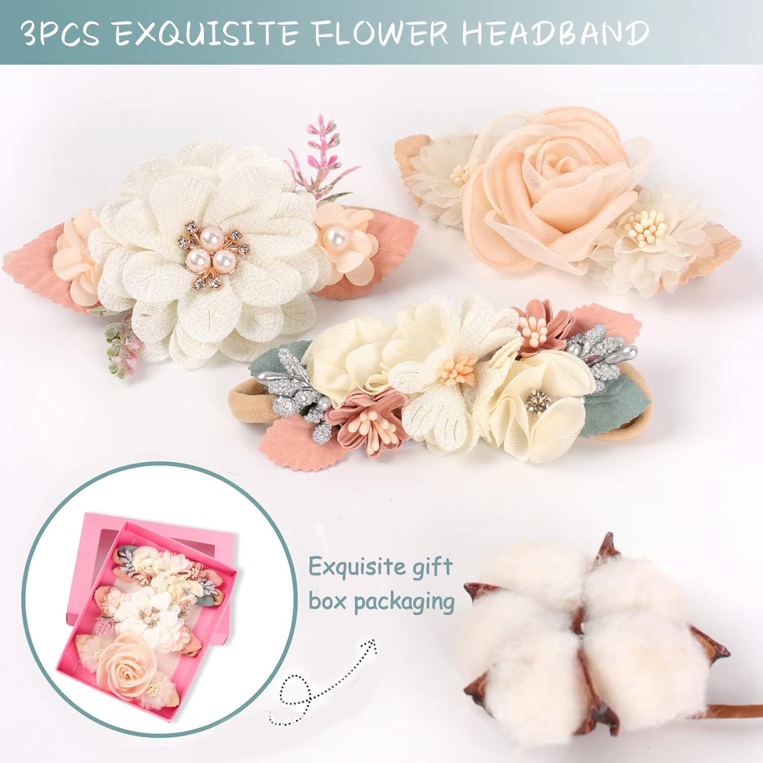 These adorable baby girl headbands are made with soft, stretchy nylon that feels gentle against your little oneâs skin while keeping their hair in place with ease. Featuring a delicate, handmade flower design, each headband adds a charming and elegant touch to any baby outfit. Lightweight and comfortable, they are perfect for everyday wear or special moments without weighing your baby down.