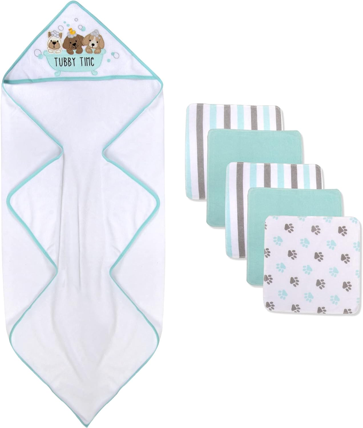 This 6-piece baby hooded towel and washcloth set is a perfect addition to any baby care routine. Designed for infants 6-12 months, it combines comfort, practicality, and style. The soft cotton blend ensures gentle skin care, while the hooded towelâs tail-wagging design adds a playful charm that makes bath time more fun for both baby and parent.