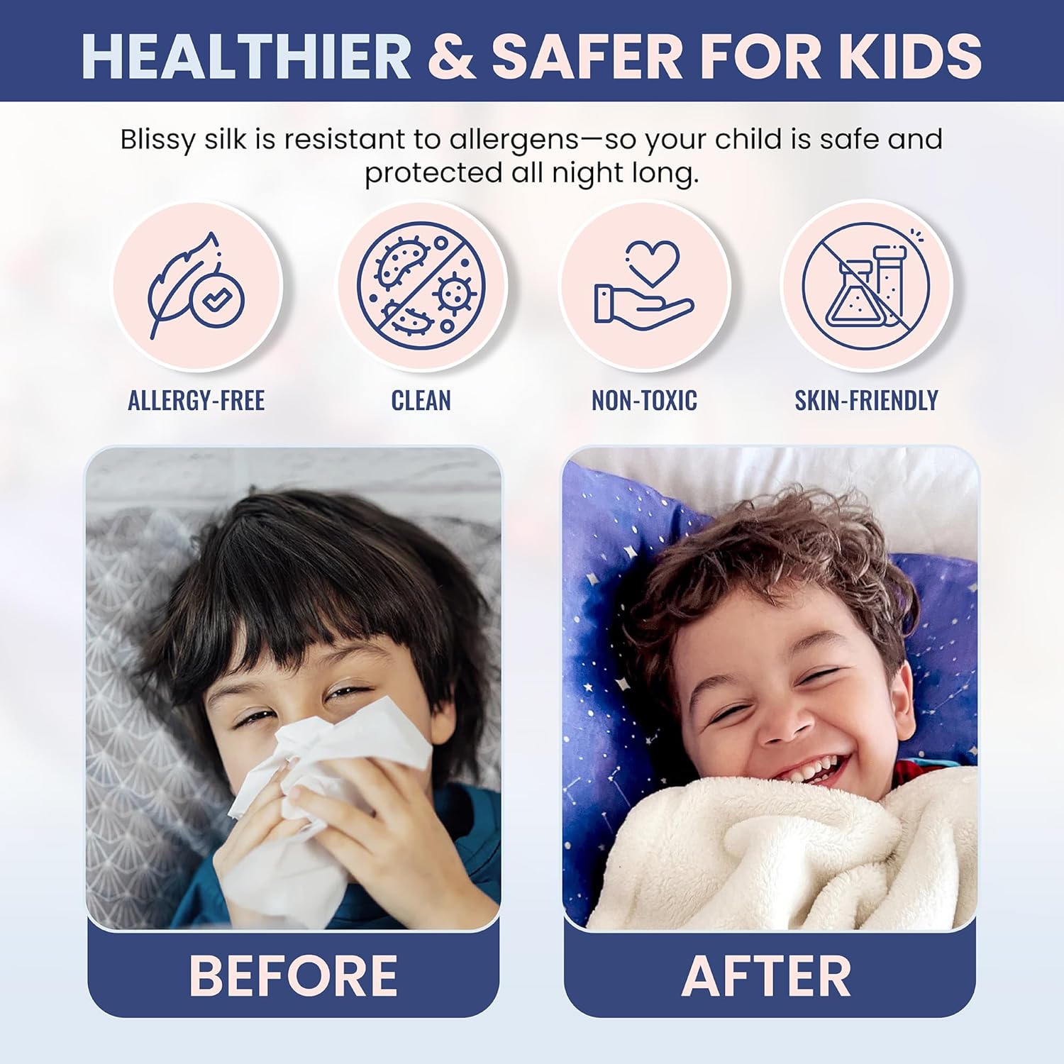 Introducing the Blissy Toddler Silk Pillowcaseâa luxurious and thoughtful addition to your child's bedroom. Crafted from 22 Momme 6A Grade Mulberry Silk, this pillowcase combines unmatched softness with long-lasting durability to provide a gentle and comfortable sleeping experience for toddlers.