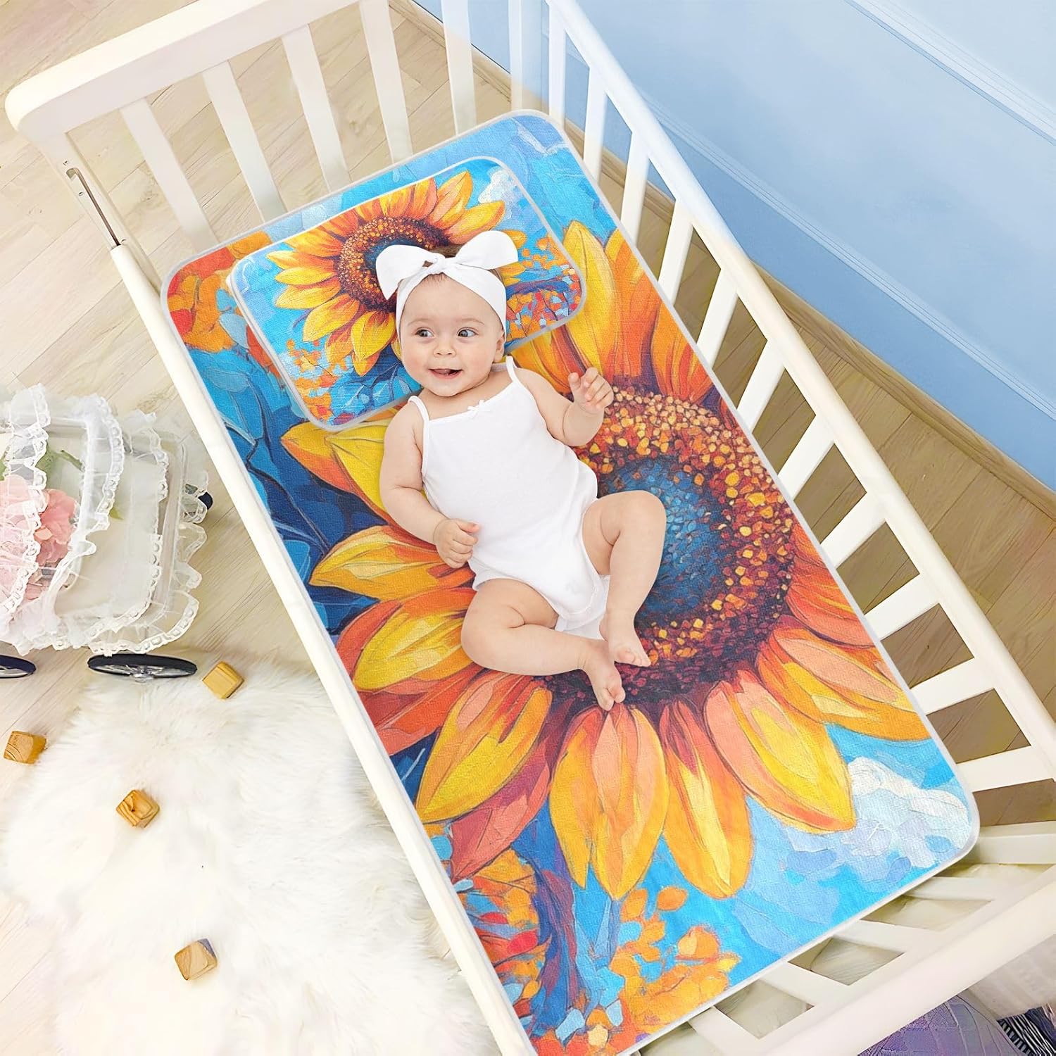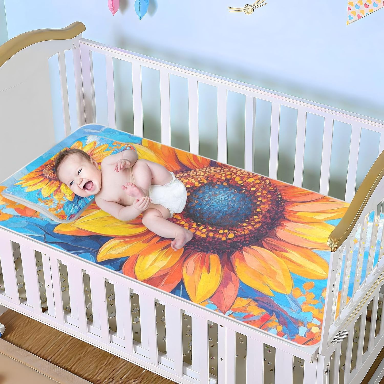 This Blue Cartoon Sunflower Cooling Mattress Pad is the perfect way to ensure your baby stays cool and comfortable on even the hottest summer nights. Crafted with advanced ice silk fabric, it features breathable holes that help regulate temperature, offering a gentle cooling effect without sacrificing the softness and warmth that babies need for restful sleep.