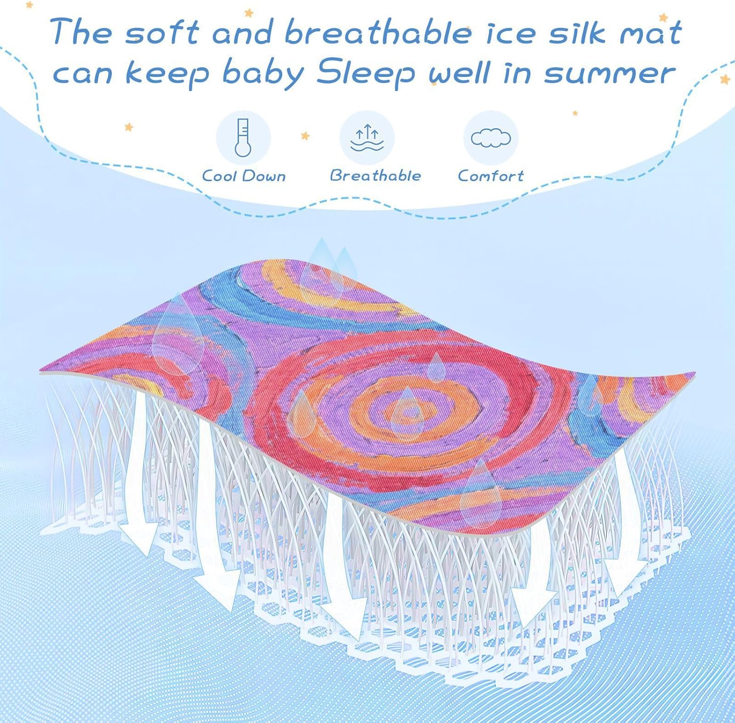 This versatile cooling baby crib mattress pad is crafted with breathable ice silk fabric, designed to keep your little one cool and comfortable during summer nights. Its unique feature of breathable holes enhances airflow, helping to regulate temperature and reduce heat. The ultra-soft knit material is gentle on sensitive skin, offering a cozy and safe sleep experience for your baby or toddler. The waterproof construction provides reliable protection against spills and accidents, ensuring a clean and healthy sleep environment. The colorful pattern adds a playful and stylish touch to your nursery, making it an attractive addition to any room.