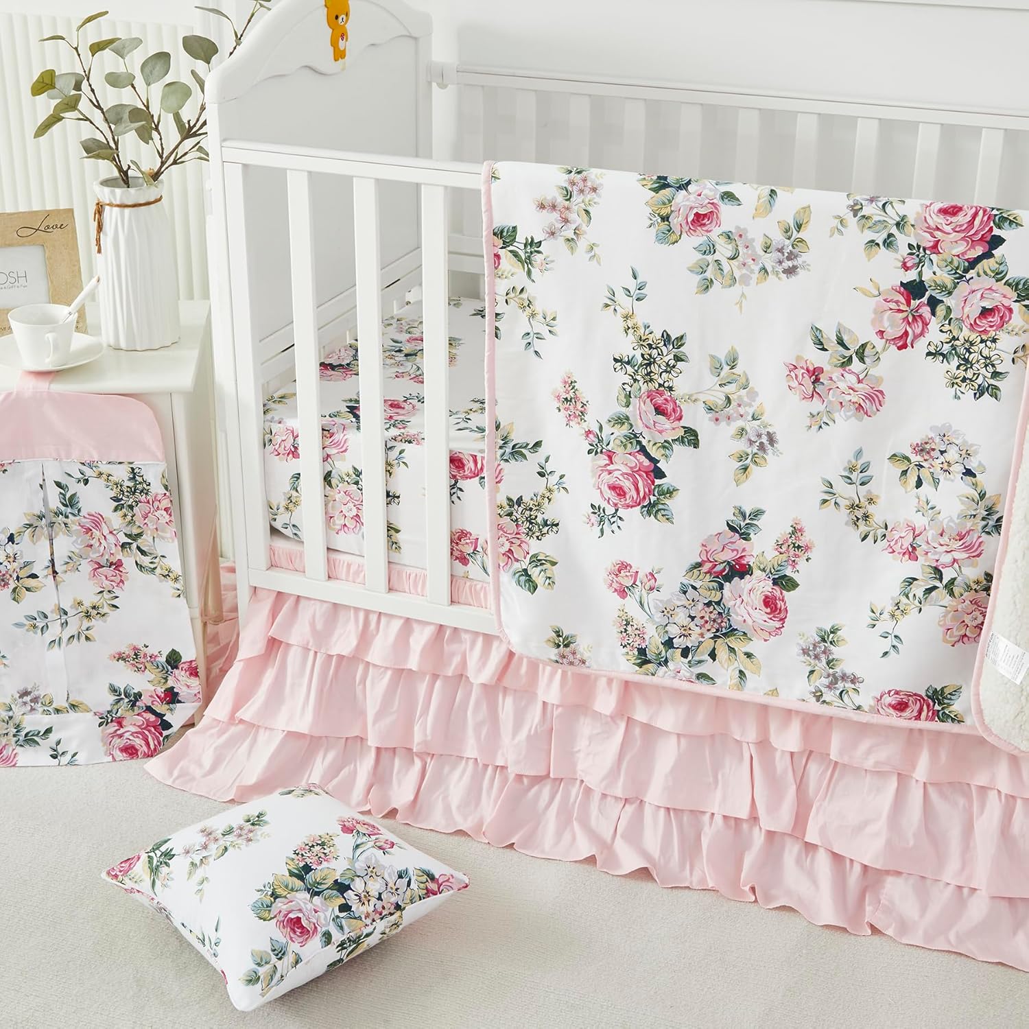 The set includes a crib quilt, sheet, skirt, valance, diaper stacker, and pillowcaseâeach designed with beautiful floral patterns and delicate ruffle details. This collection not only enhances the aesthetic of your nursery but also adds a touch of luxury to your babyâs daily routine. Whether you're setting up a crib or using it as a styling element for a sofa bed, this set offers timeless charm and a serene atmosphere for your child.