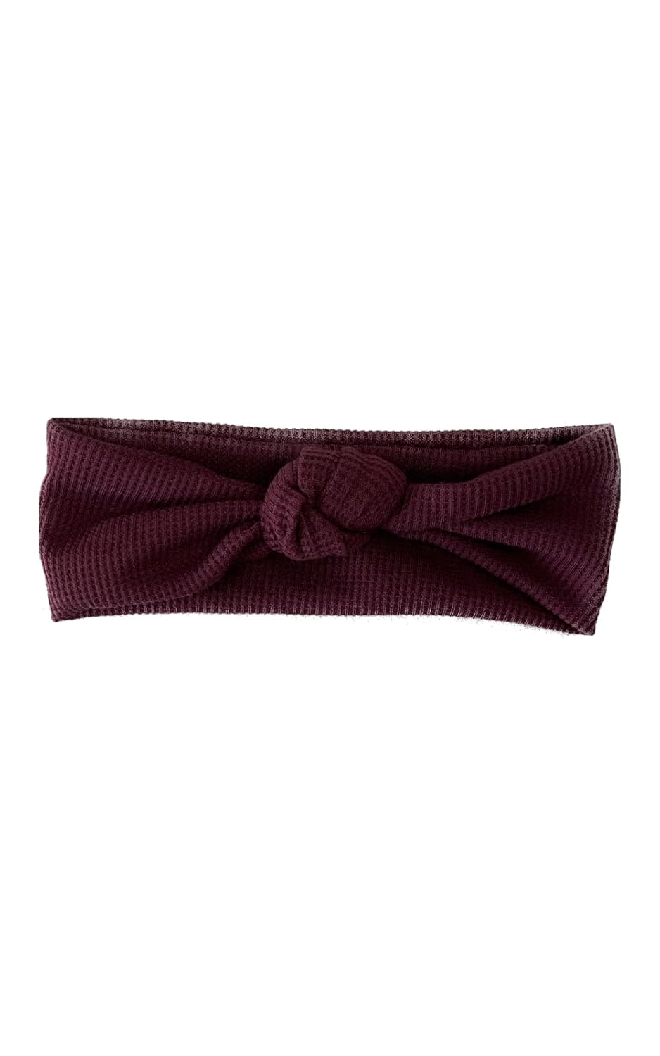 A soft, stretchy burgundy waffle weave headband with a secure knot. Handmade for newborns and infants up to 6 months, it's perfect for fall outfits and daily wear. Versatile as a headband or hair bow, it adds elegance and style.