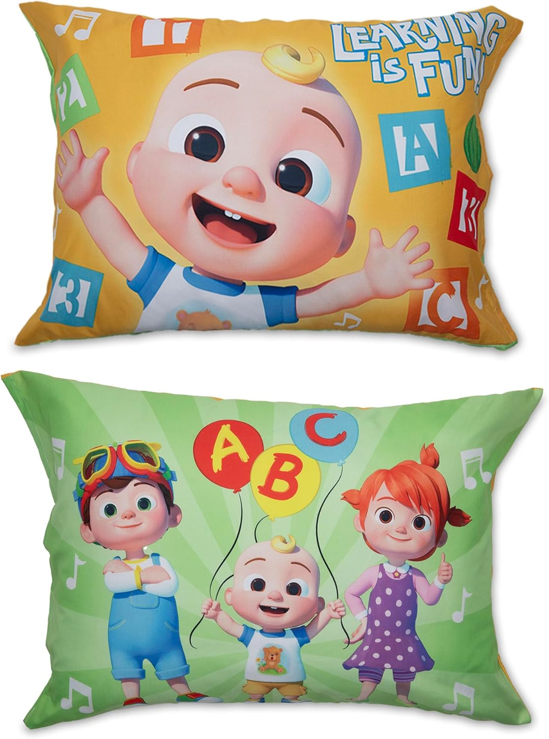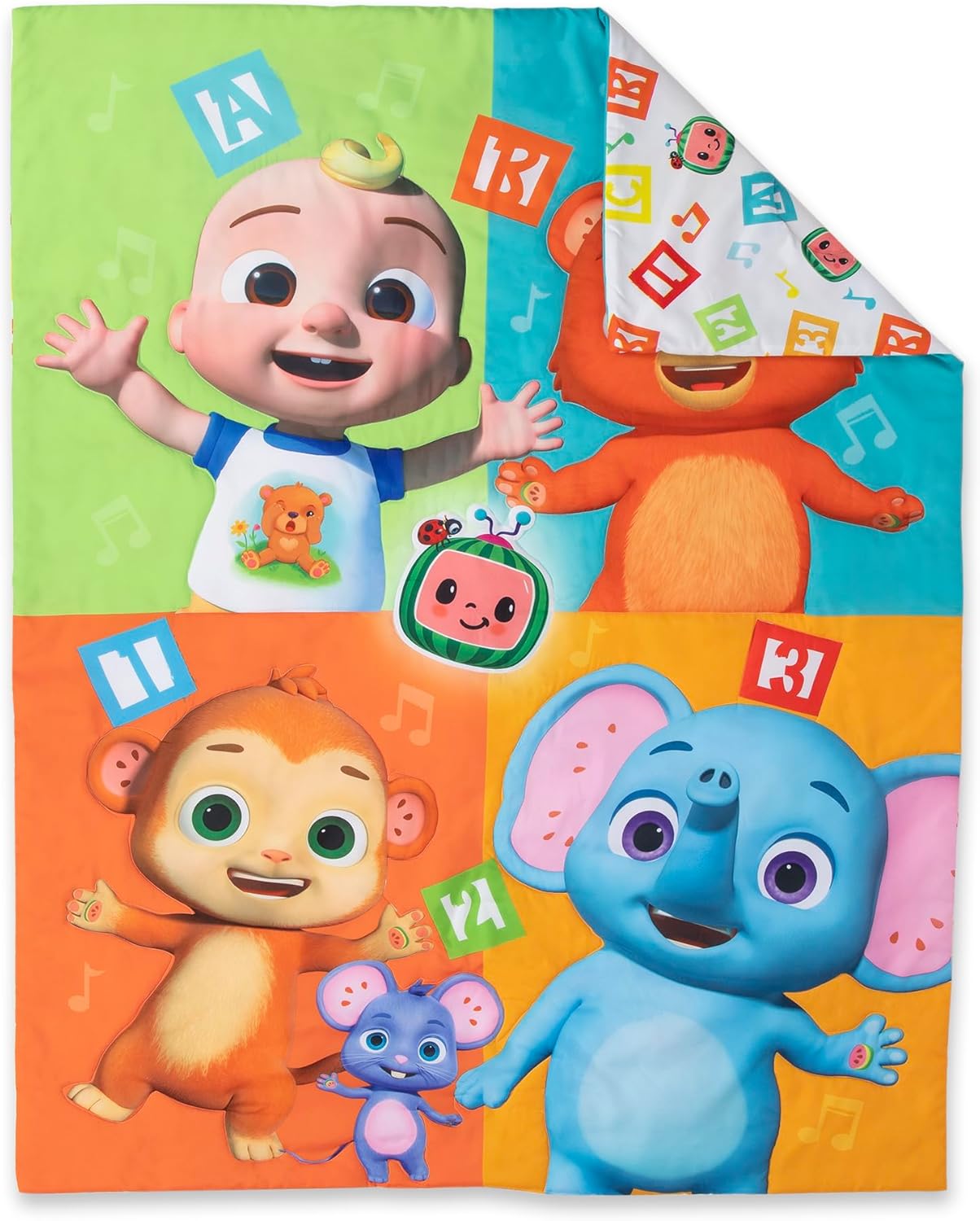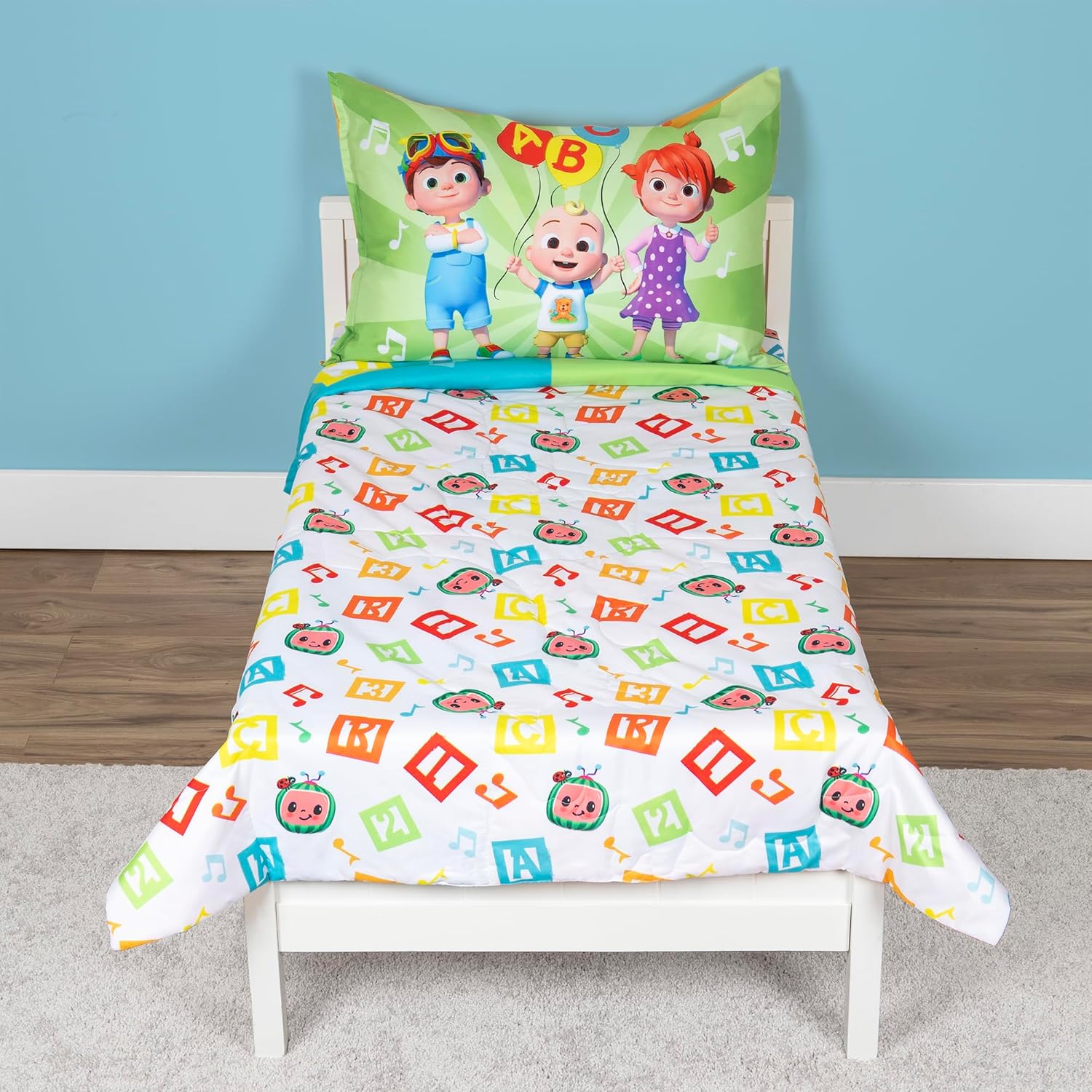 Transform your toddlerâs bedroom into a playful learning space with this 4-piece CoComelon toddler bedding set. Designed with beloved characters like J.J. and his animal friends, it encourages imagination and makes bedtime an adventure. The set includes a comforter, fitted sheet, flat sheet, and a reversible pillowcase, offering a complete and stylish solution for little ones.