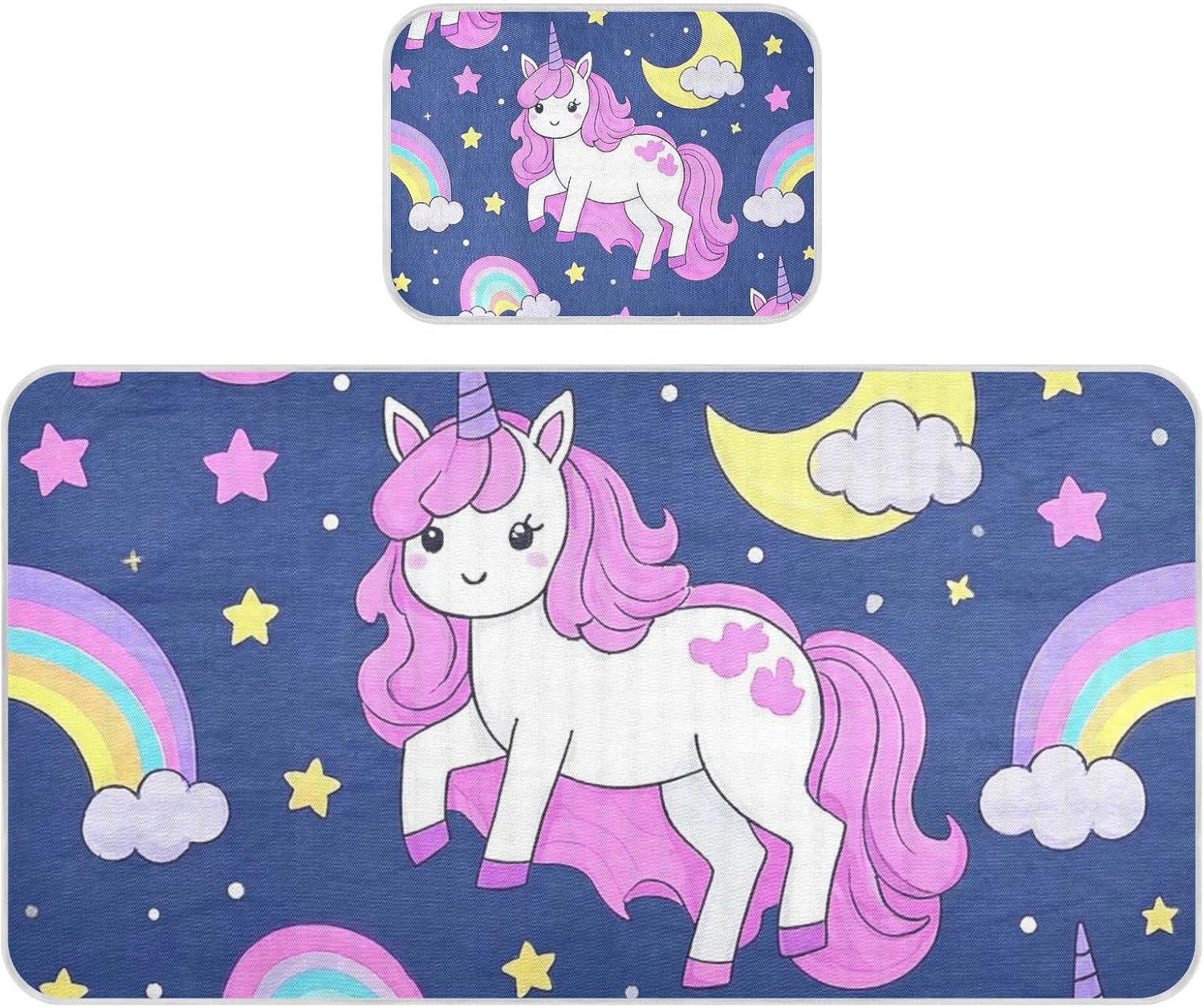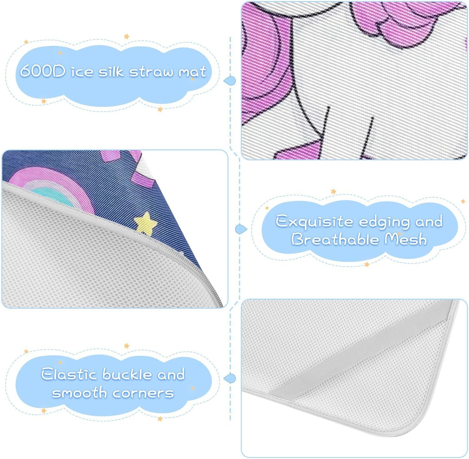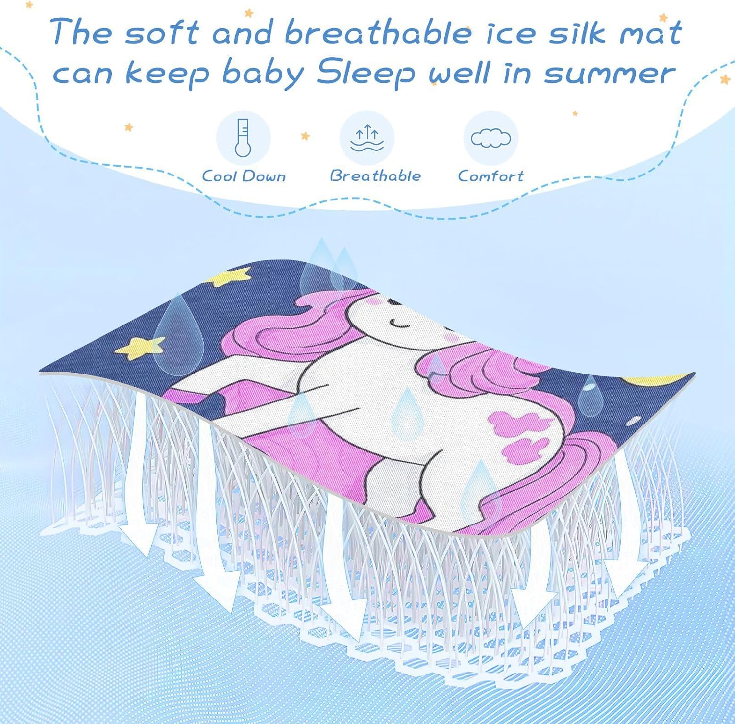 This unicorn-themed baby mattress pad offers cooling comfort with ice silk fabric and breathable holes. Soft and skin-friendly knit ensures gentle sleep, while the thick mesh layer adds cushioning. Perfect for baby cribs and toddler beds, it's easy to clean and reusable.