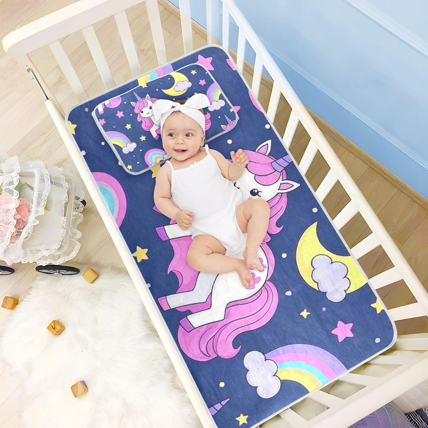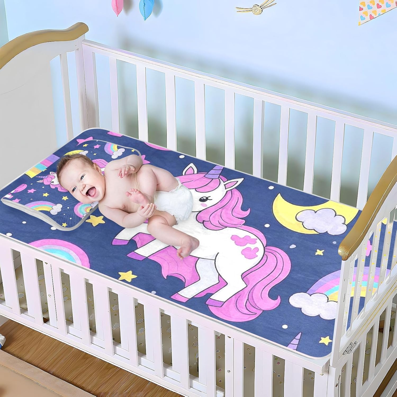 Cooling baby mattress pad, unicorn themed mattress protector, breathable mattress pad for baby, soft and skin-friendly baby bed pad, reusable toddler mattress protector