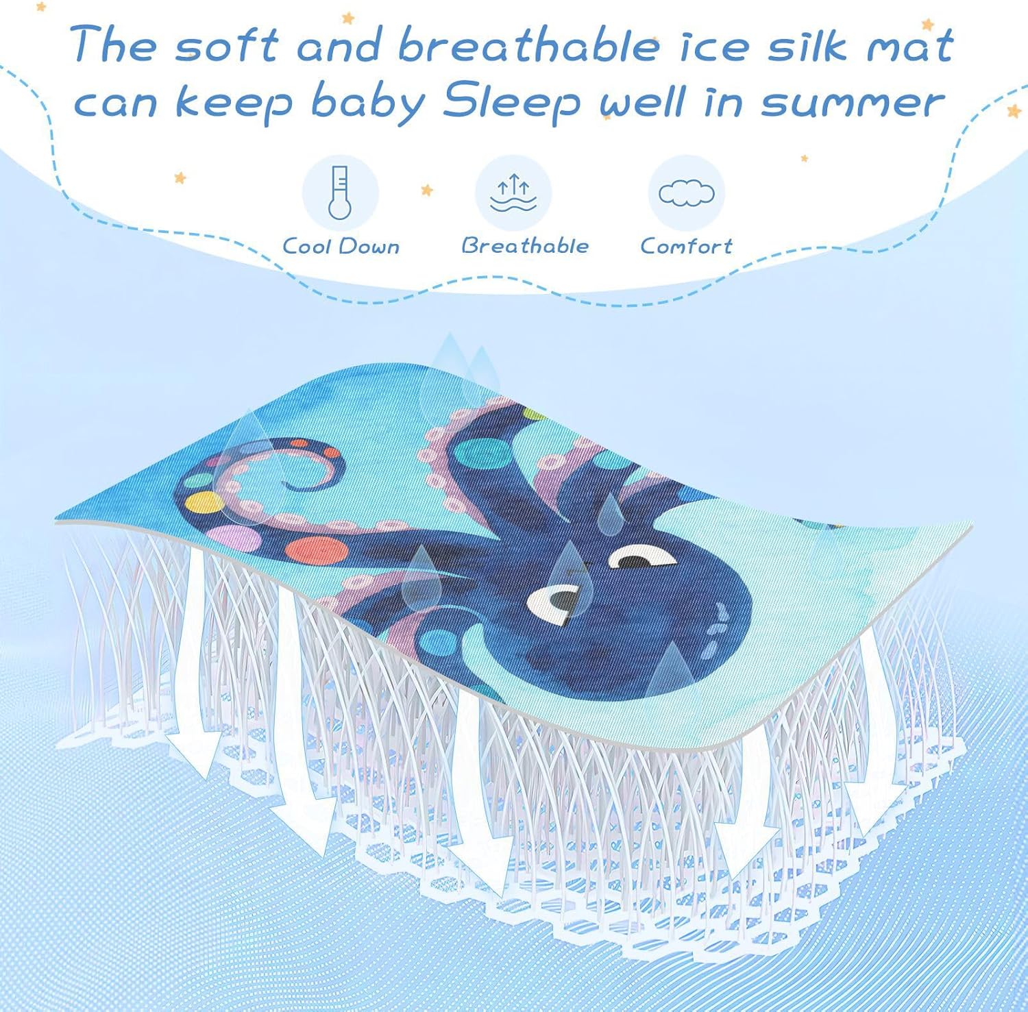 Adorable marine animal themed mattress pad with cooling technology for baby and toddler. Soft, skin-friendly fabric, easy to clean, and perfect fit for standard crib and toddler mattresses. Ideal for hot summer nights and year-round use. Great gift for baby showers and birthdays.