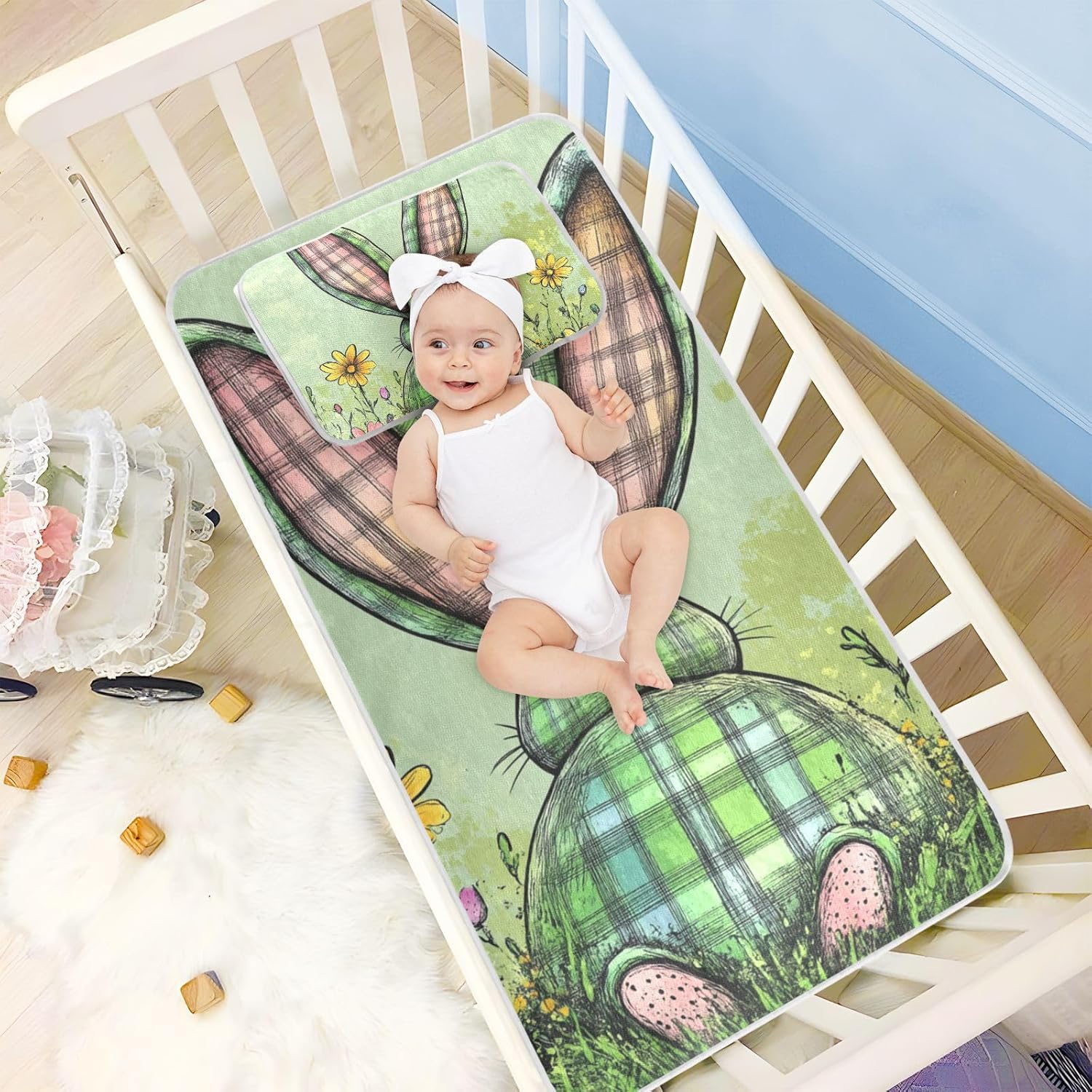 Keep your baby cool and comfortable all night with this stylish and functional plaid bunny ear mattress pad cover. Designed to enhance sleep quality in warmer months, it utilizes cooling ice silk fabric with breathable holes to maintain a fresh and airy environment. The soft, skin-friendly material is gentle on your baby's delicate skin, while the thick mesh layer offers extra support and cushioning for safe and cozy rest.