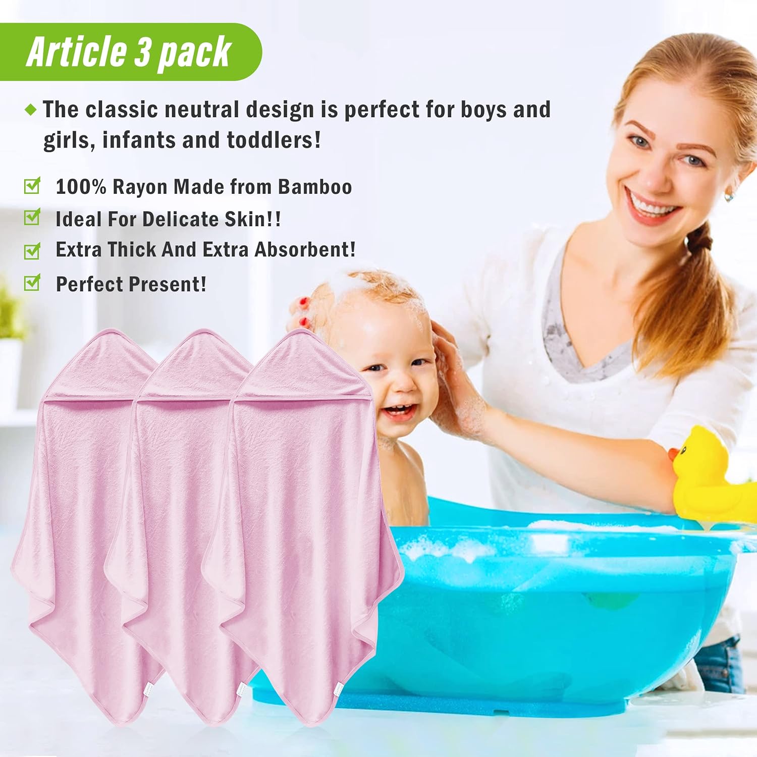 Gently wrap your little one in these 3-pack baby hooded towels, crafted from the softest bamboo rayon for a luxurious feel thatâs safe for delicate skin. Perfectly designed to provide warmth and comfort after every bath, these towels offer a special touch of care for newborns and toddlers.