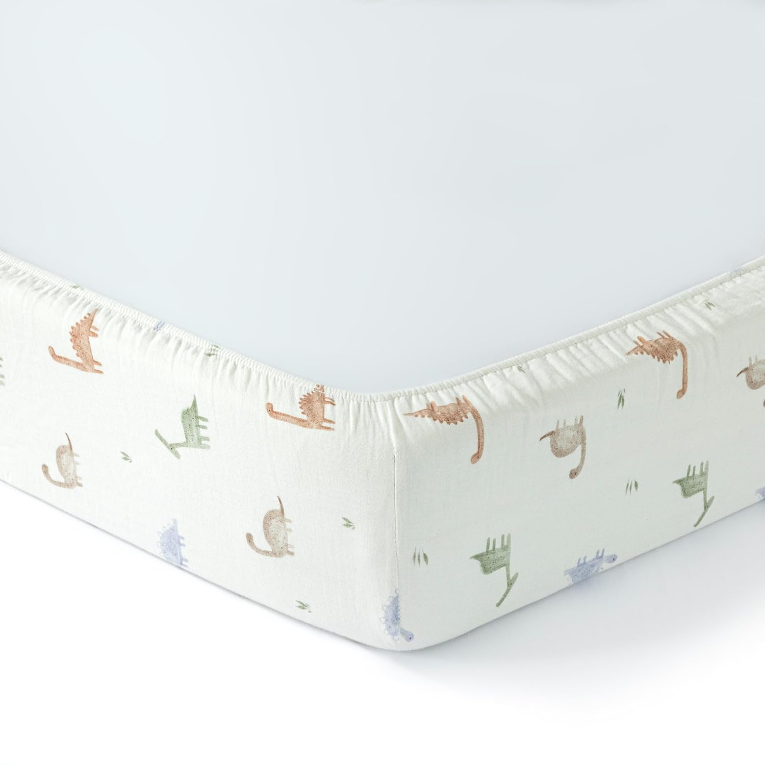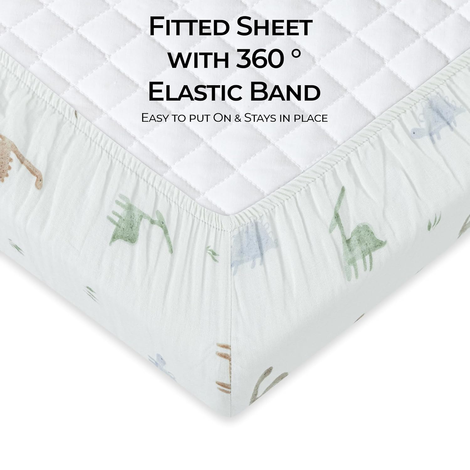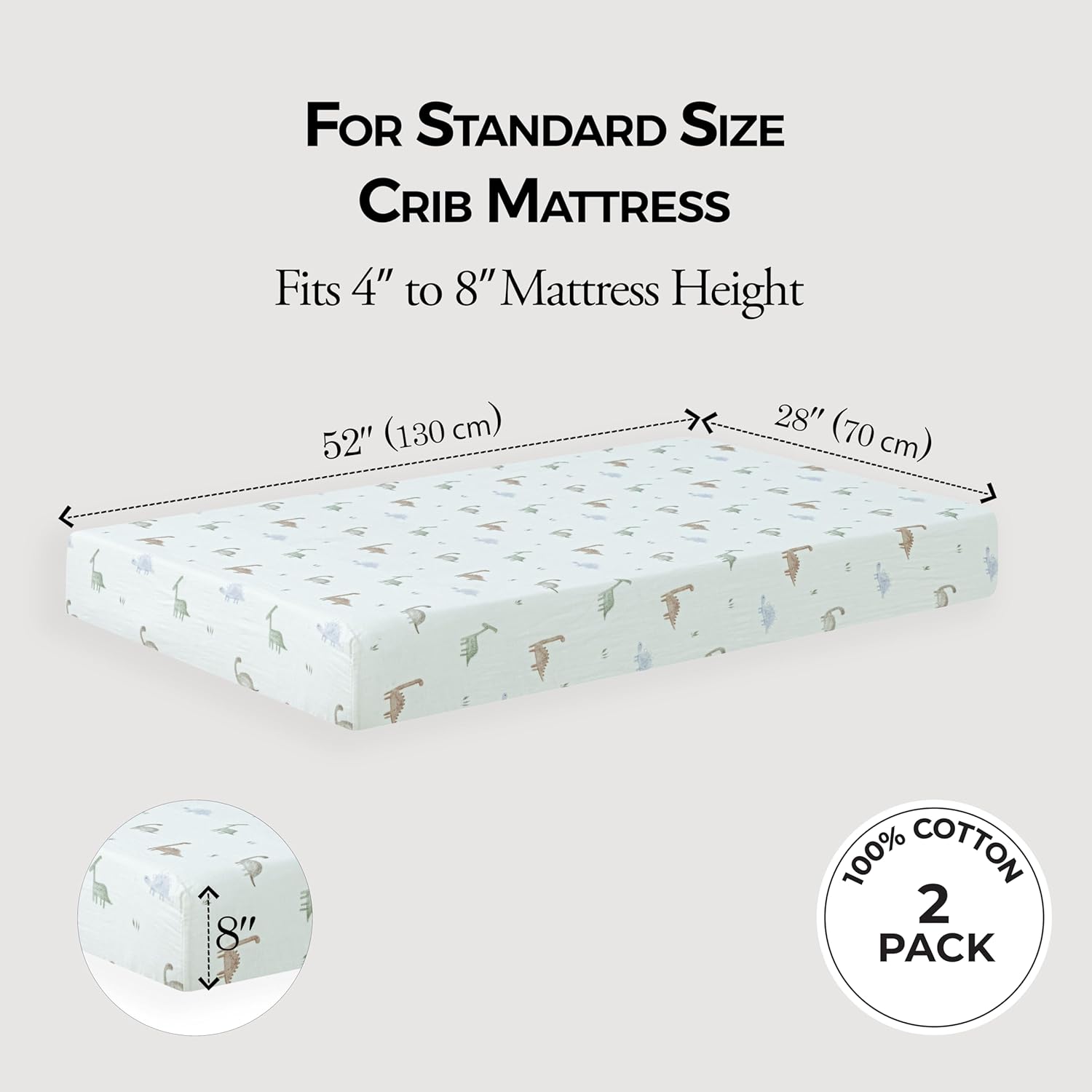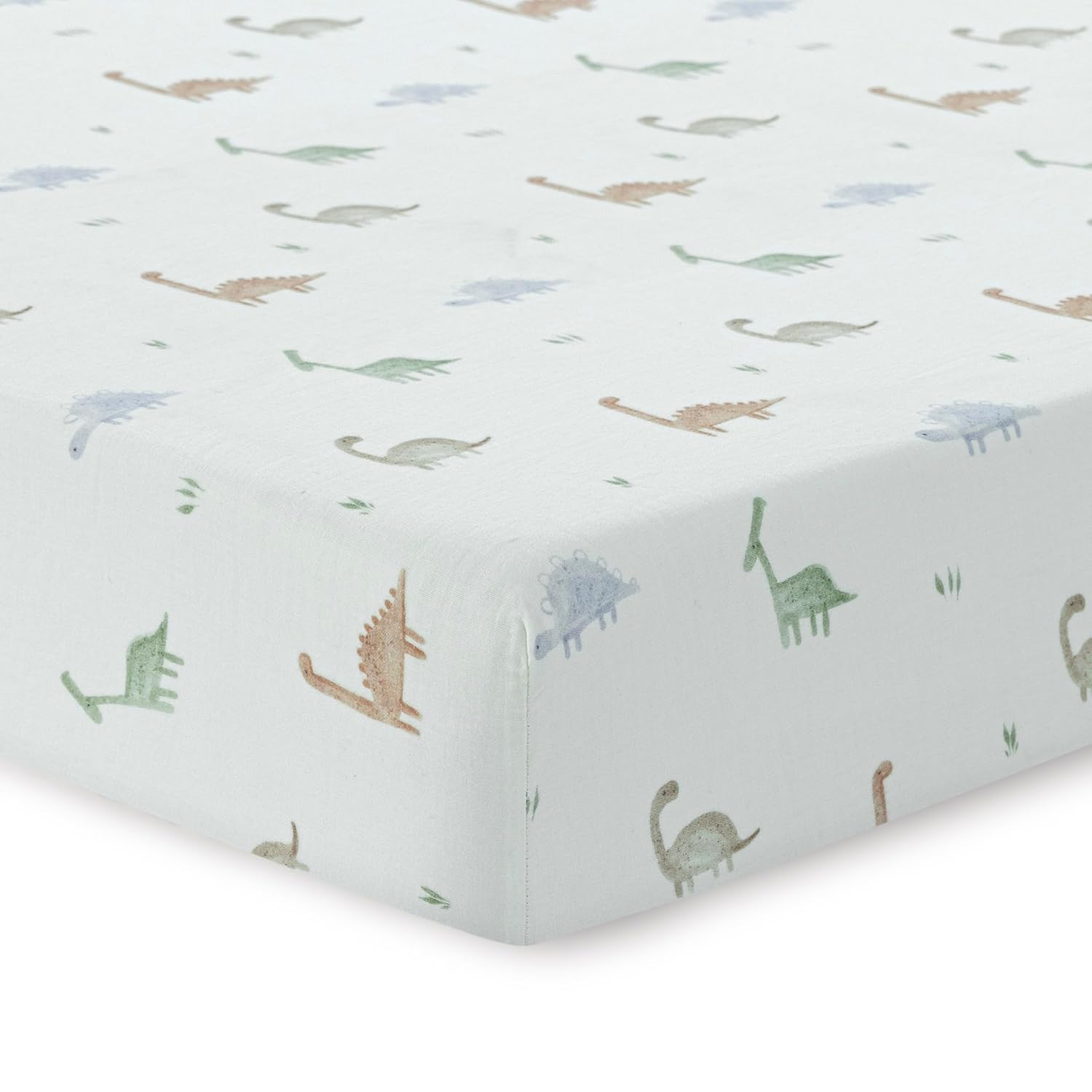 Designed with 8-inch deep pockets, they ensure a secure fit on standard crib mattresses, keeping your baby safe during every nap. Whether you're decorating for a boy or a girl, the dino theme adds a playful and elegant twist to any nursery, making these sheets a perfect blend of style and practicality.