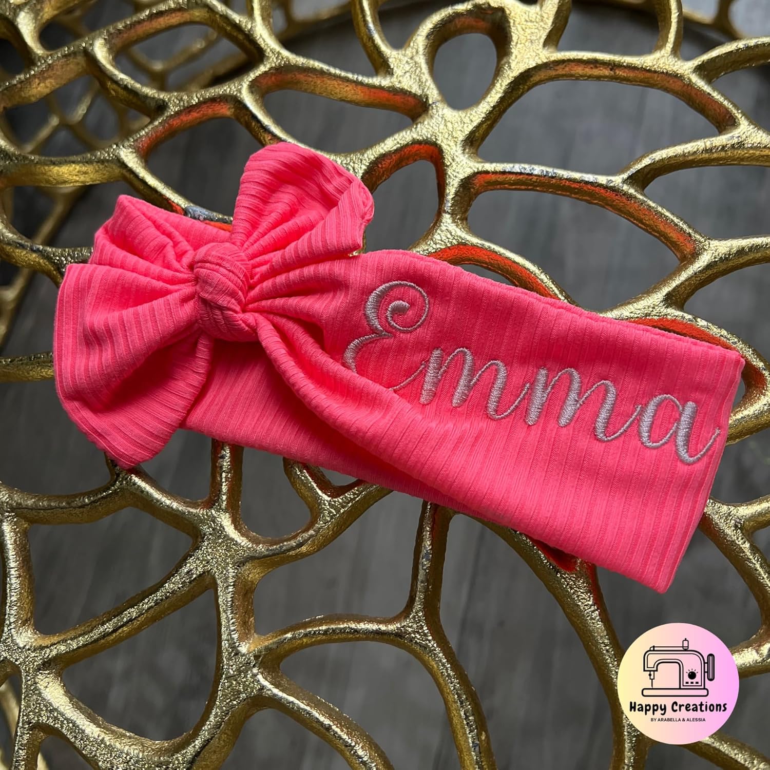 This embroidery headband is not just a practical pieceâitâs a statement. The neon fabric ensures itâs visible and vibrant, making it a standout item for any little girlâs wardrobe. With its customizable name and elegant bow, itâs the perfect way to make her outfit pop and add a personal feel to any event.