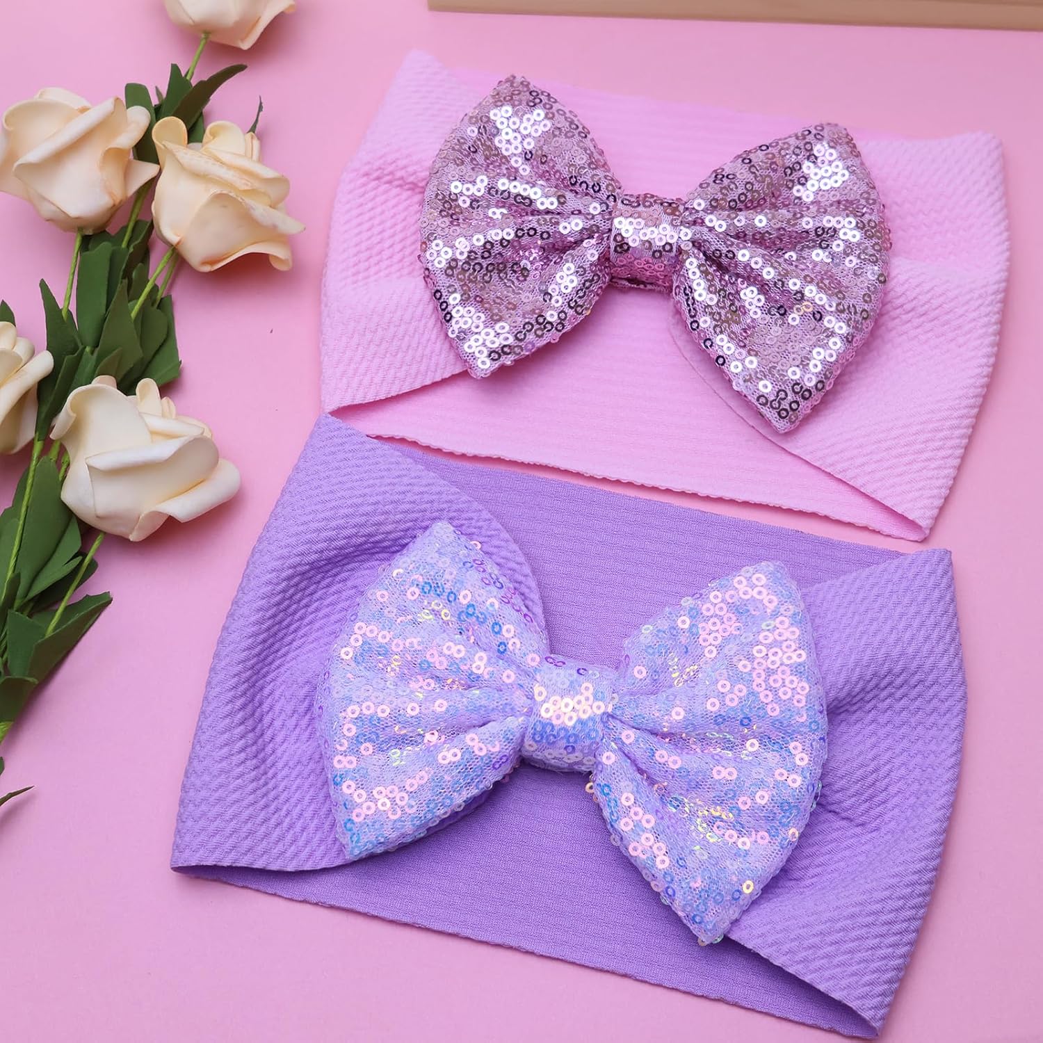 These baby bow hairbands are a perfect blend of style and comfort. Made with ultra-soft, breathable fabric, they are gentle on your baby's delicate skin and offer a cozy fit that wonât irritate or pull. The 7\" size features a delightful bow design with alternating purple and pink sequins, creating a whimsical touch for any little oneâs outfit. Whether itâs a morning stroll or a special celebration, these hairbands ensure your baby stays looking fabulous and ready for any adventure.