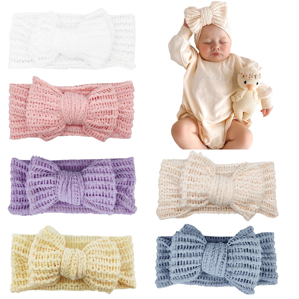 Handmade baby headbands with bows in 6 colors, ideal for newborns and toddlers. Soft, stretchy, and no mark leave, perfect for everyday wear and special occasions.