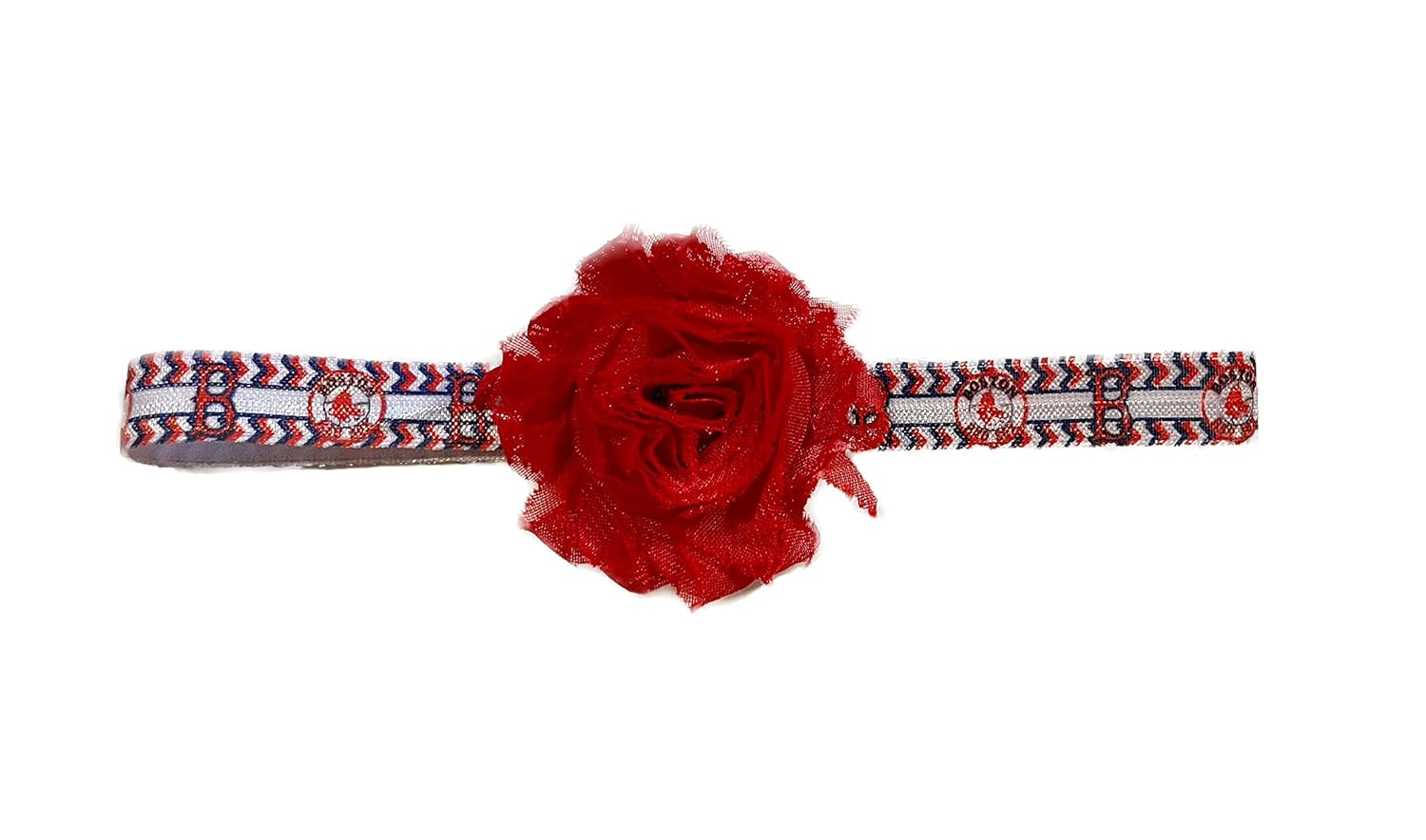 A soft, elastic headband with a red sox design and shabby flower details for baby girls. Keeps hair neat and stylish while being comfortable and safe for everyday use. Great for baseball fans, adding a unique and personalized touch to any occasion.
