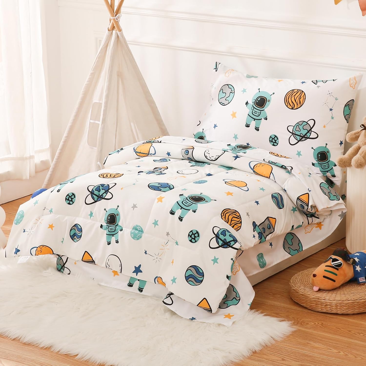 Dress your little explorerâs room in a stylish and comfortable way with this adorable astronaut-themed toddler bedding set. Designed for both play and rest, it adds a fun touch to bedtime while keeping your child cozy and safe.