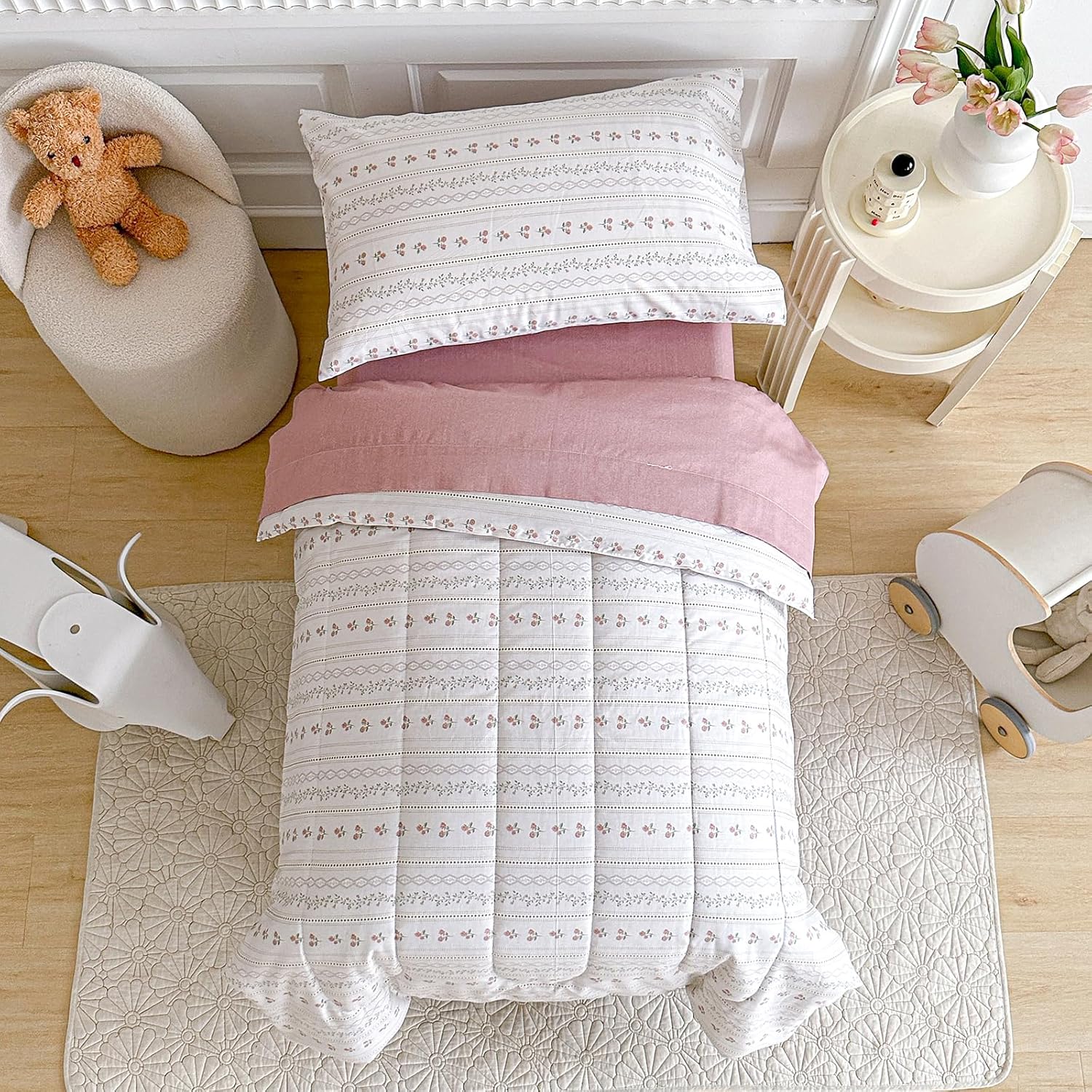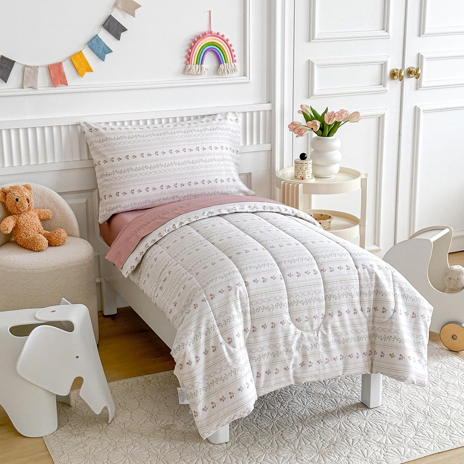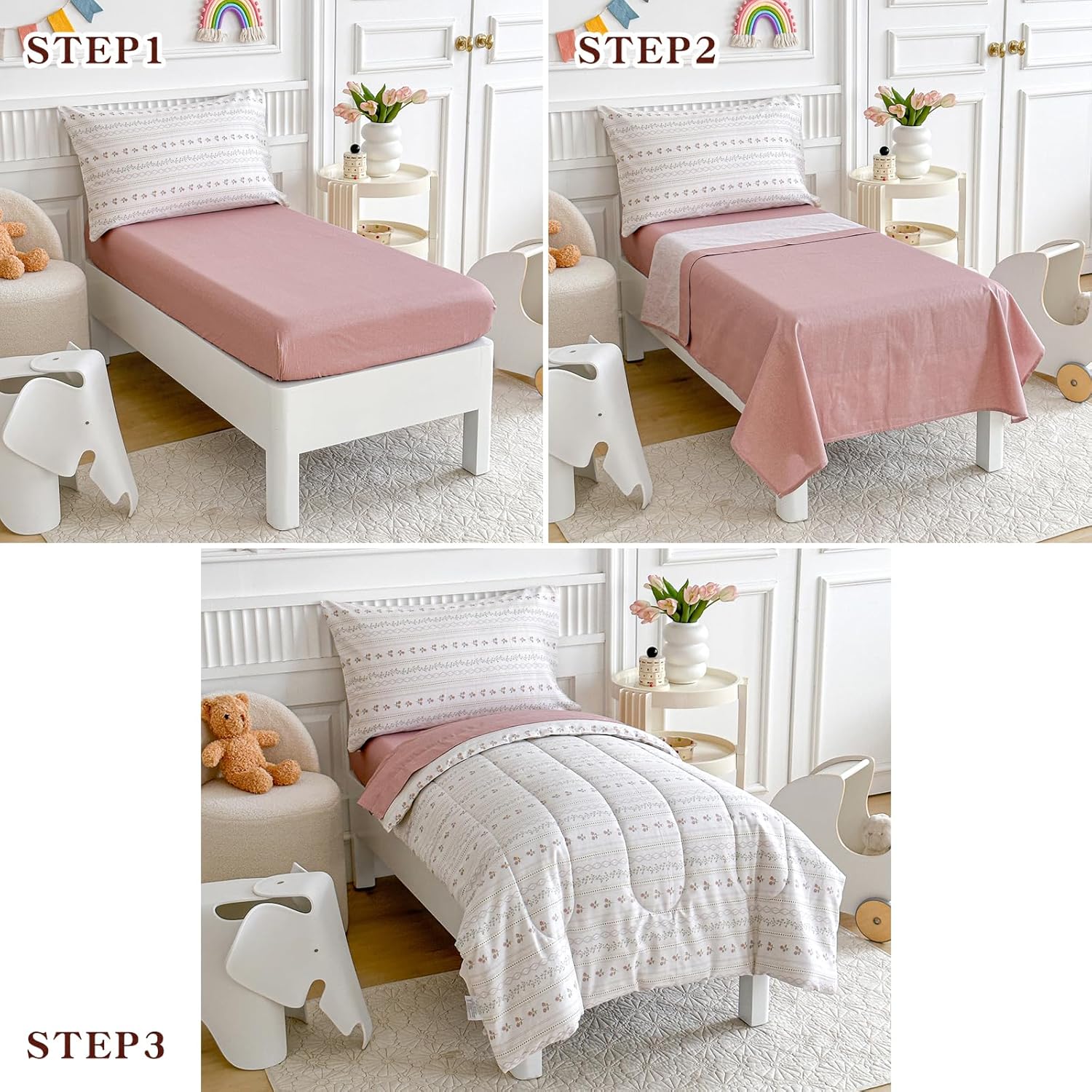 Joyreap's 4-piece cotton toddler bedding set for girls includes a reversible comforter, fitted sheet, top sheet, and pillowcase. Made of 100% premium cotton, it offers softness, breathability, and a boho design with floral and solid pink accents. Ideal for creating a comfortable and stylish sleep environment for your little one.