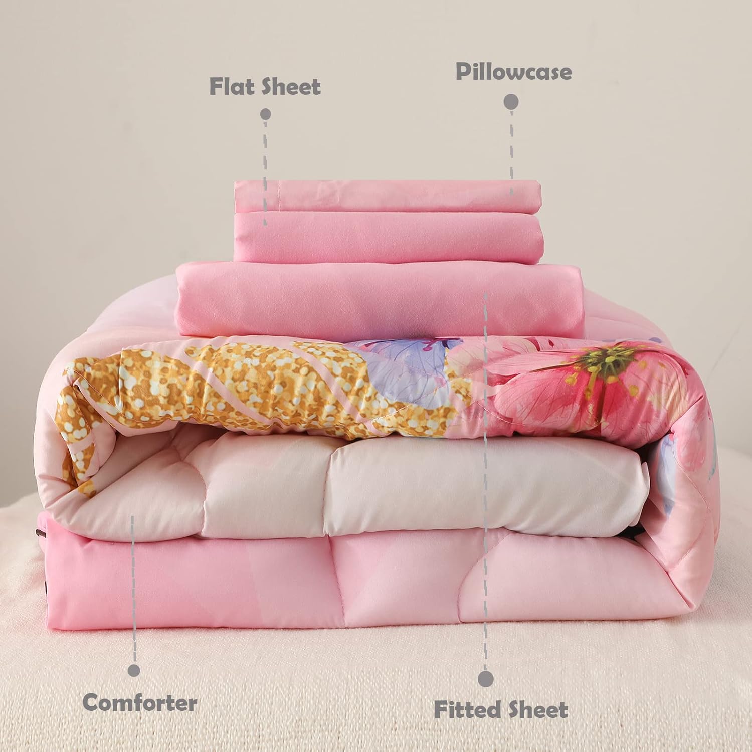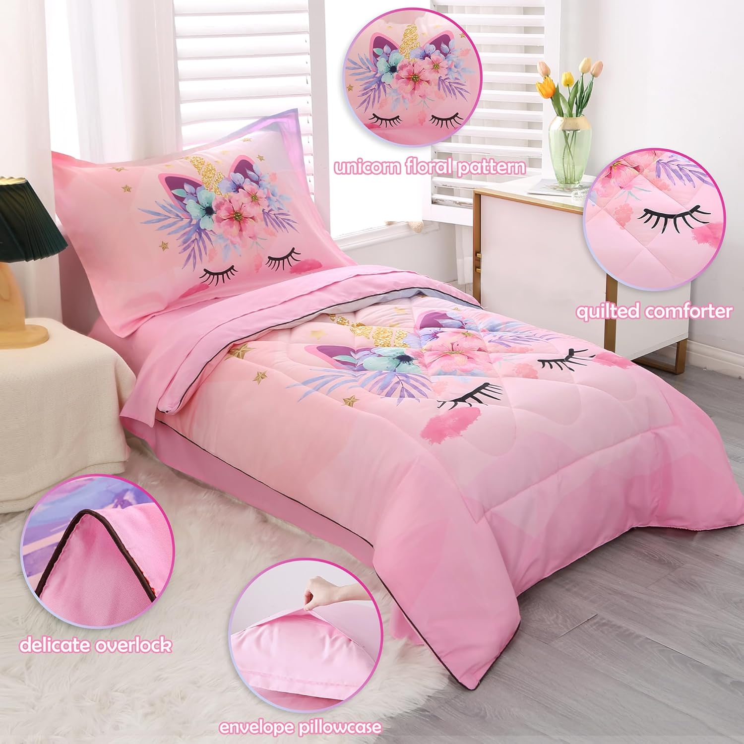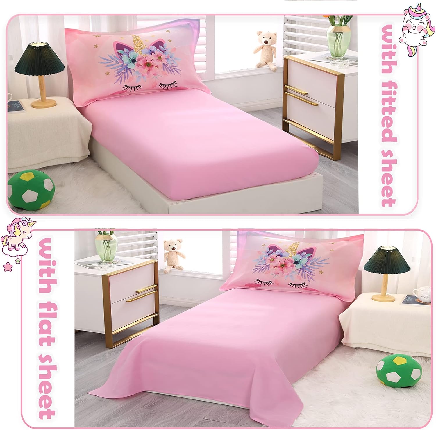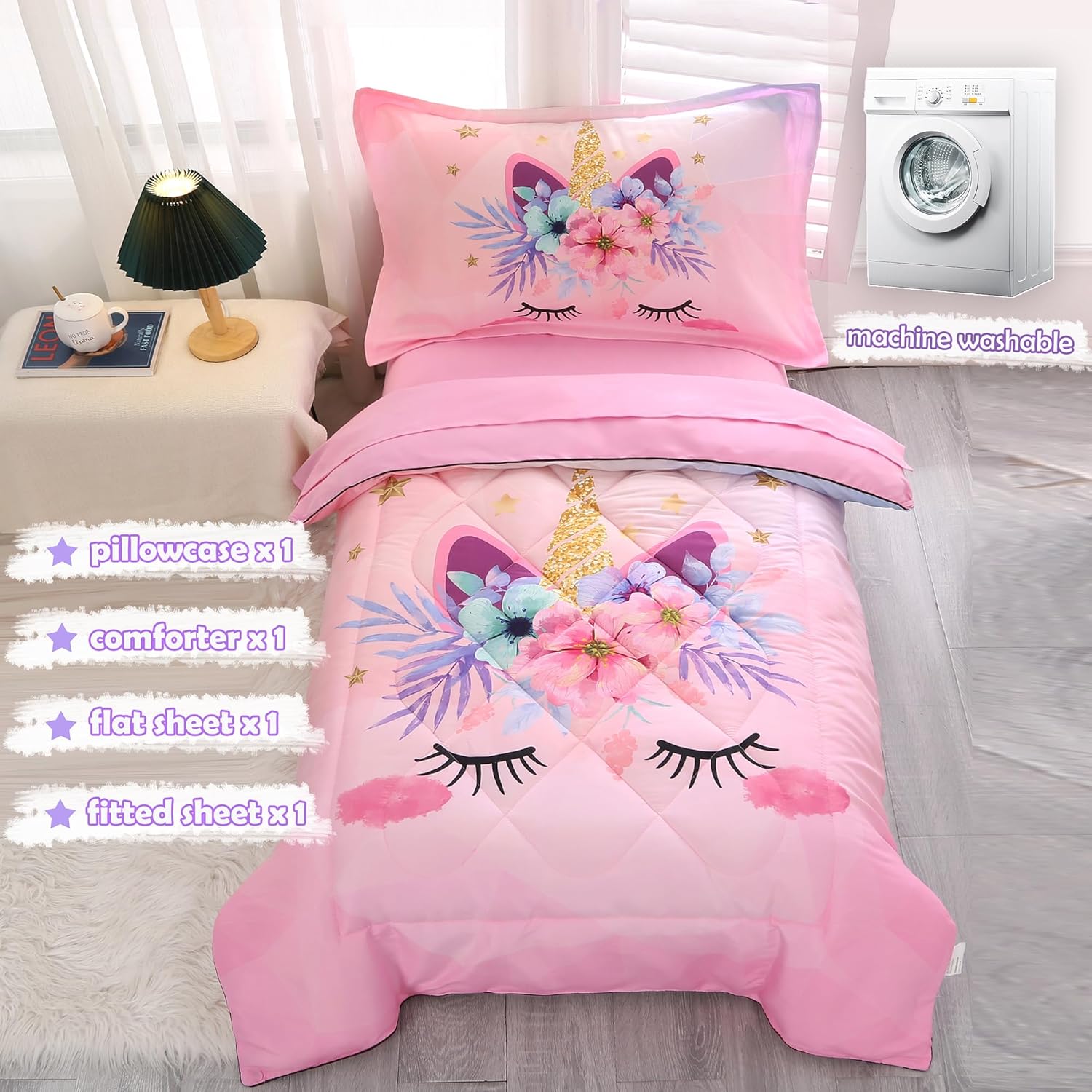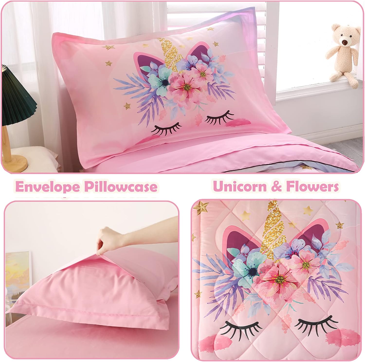 Featuring a charming unicorn and floral pattern with glitter details, this set brings a touch of fantasy and sweetness to your childâs bedroom. The vibrant pink, purple, and blue color scheme adds a playful and enchanting vibe.