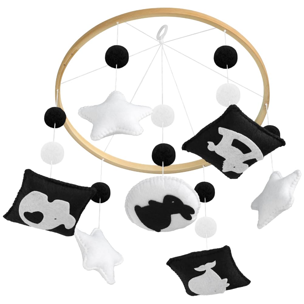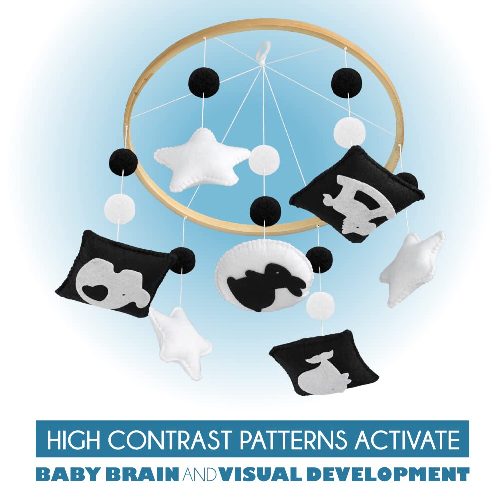 This Montessori mobile is designed to support your baby's early visual growth with a striking black and white pattern that offers high contrast stimulation. The carefully chosen colors are ideal for newborns, helping to captivate their attention and promote sensory development from the very start. Featuring 5 unique and engaging shapes, this mobile encourages your little one to explore their surroundings and discover the wonders of the world through sight.