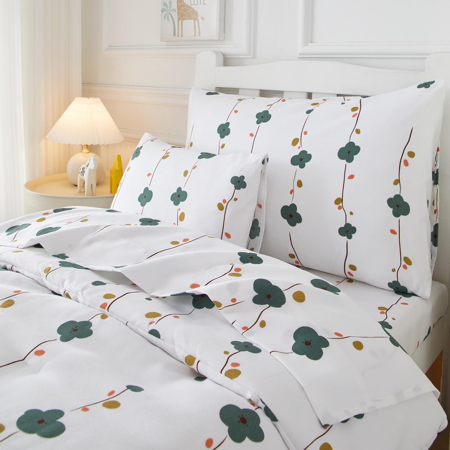 Featuring a delicate floral printed design on a white background, this set adds a touch of beauty and whimsy to any nursery. It includes all the essentials: a comforter, flat sheet, fitted sheet, and two pillowcases, all perfectly sized for a toddler crib. Whether you're setting up a bedtime routine or looking for a thoughtful gift, this set offers convenience and style in one.