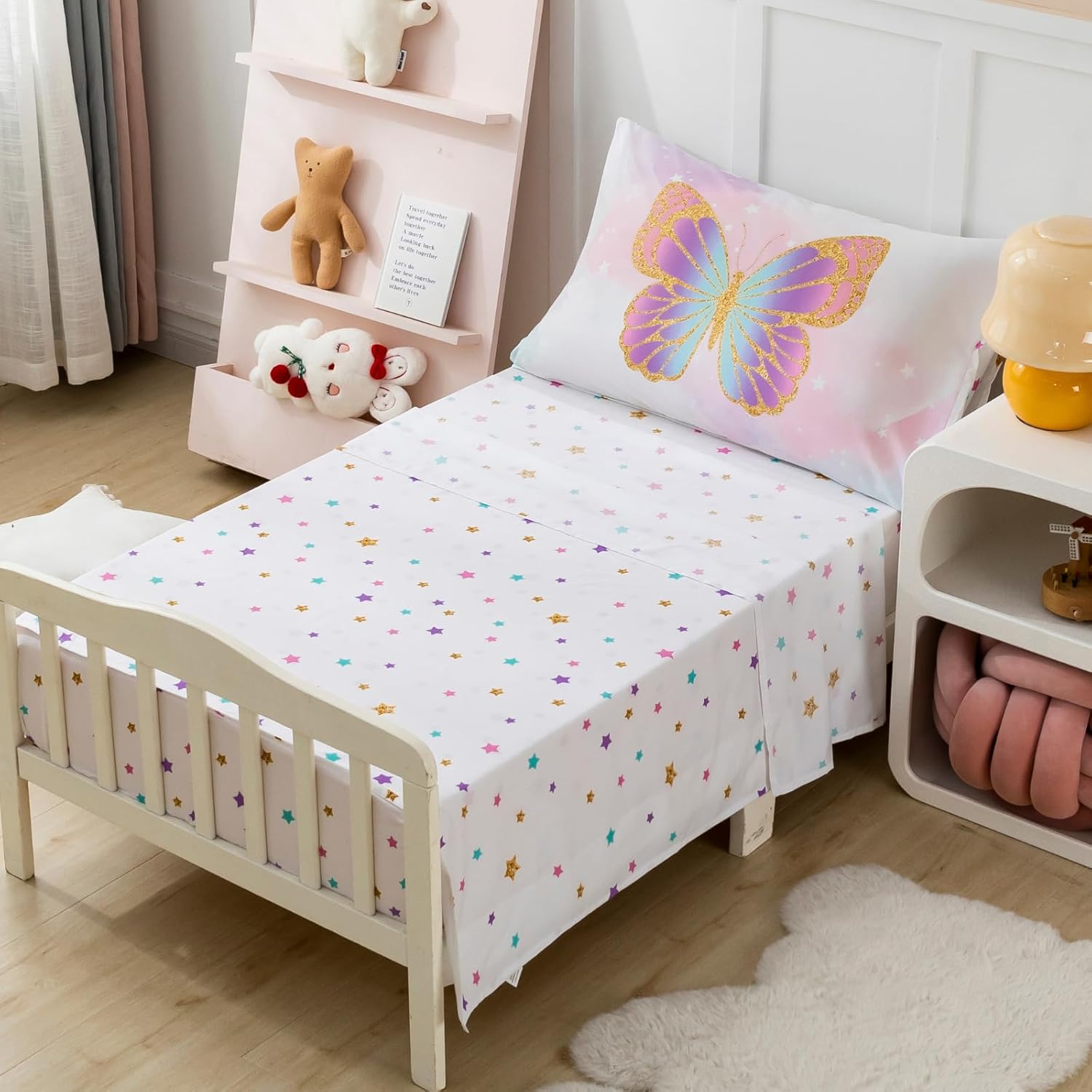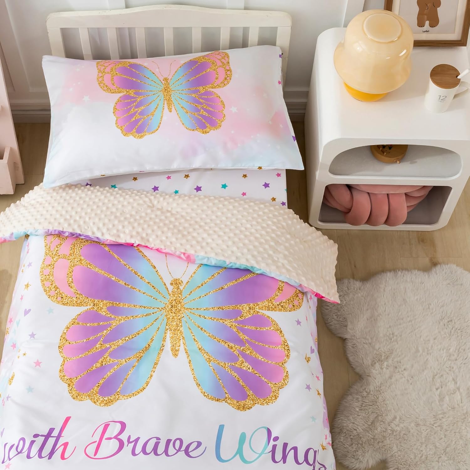 Create a dreamy and cozy sleep environment for your little one with the PINNKKU 4-Piece Toddler Bedding Set. This soft and lightweight bedding collection is made from ultra-soft brushed microfiber, providing a gentle touch that makes bedtime feel like a peaceful escape. The reversible comforter features a charming butterfly and sparkle design, adding a whimsical and playful element to your baby's room.
