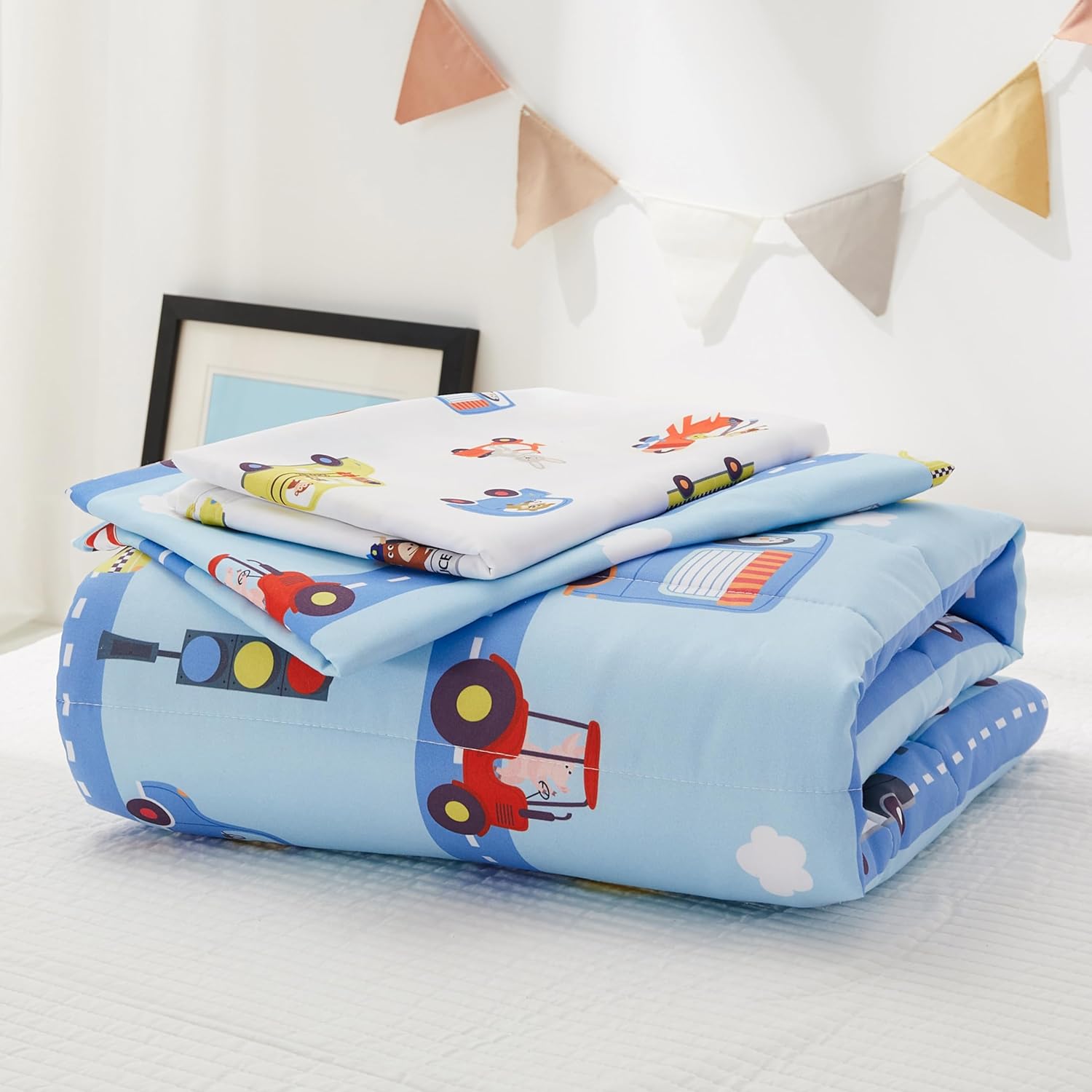 With its playful car and road design, this set adds a touch of adventure to your child's bedroom. Whether it's a baby shower gift for boys or a holiday present for car enthusiasts, this bedding set is both thoughtfully crafted and eye-catching. The reversible comforter and pillowcase offer versatility, allowing you to switch up the look effortlessly. All pieces are tailored to fit a standard toddler mattress, ensuring easy setup and seamless use.