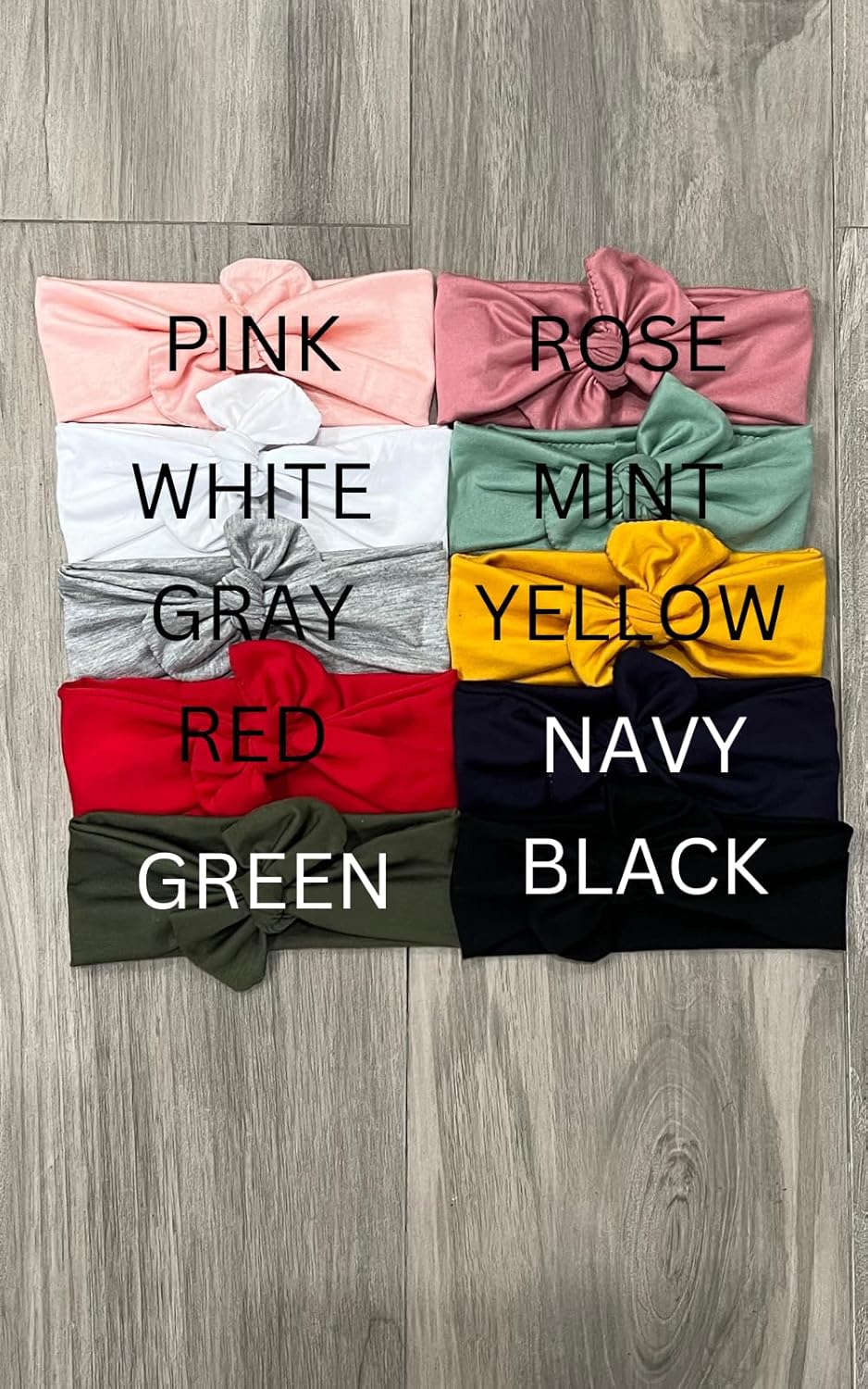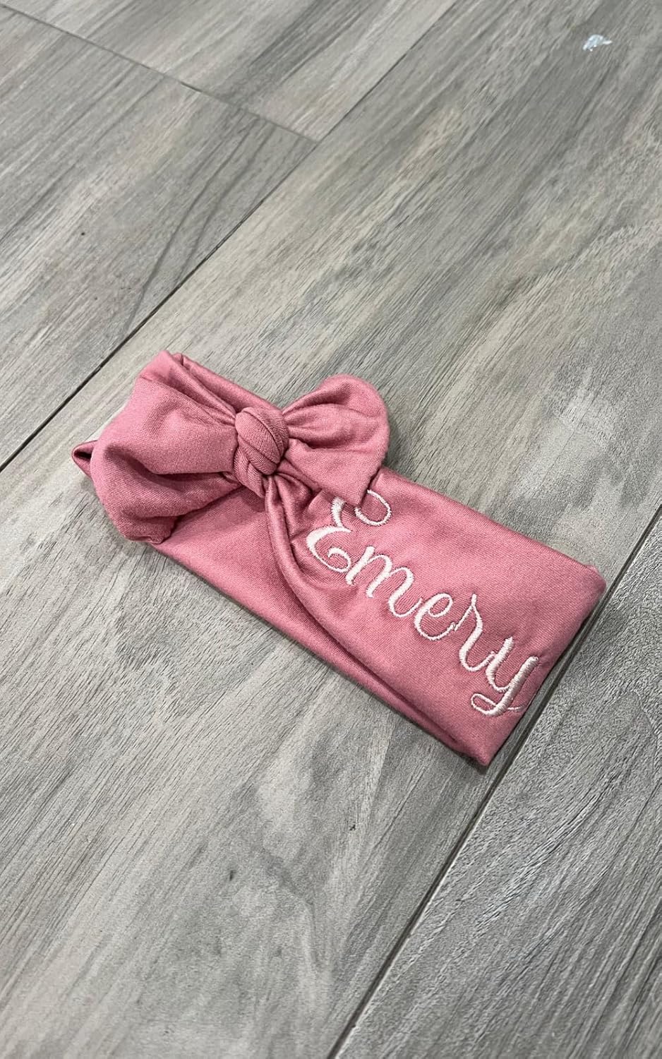 A soft, stretchy knit headband for girls featuring a personalized name and elegant rose design with bow. Perfect for newborns and toddlers, it offers comfort and style while being a handmade and high-quality accessory.