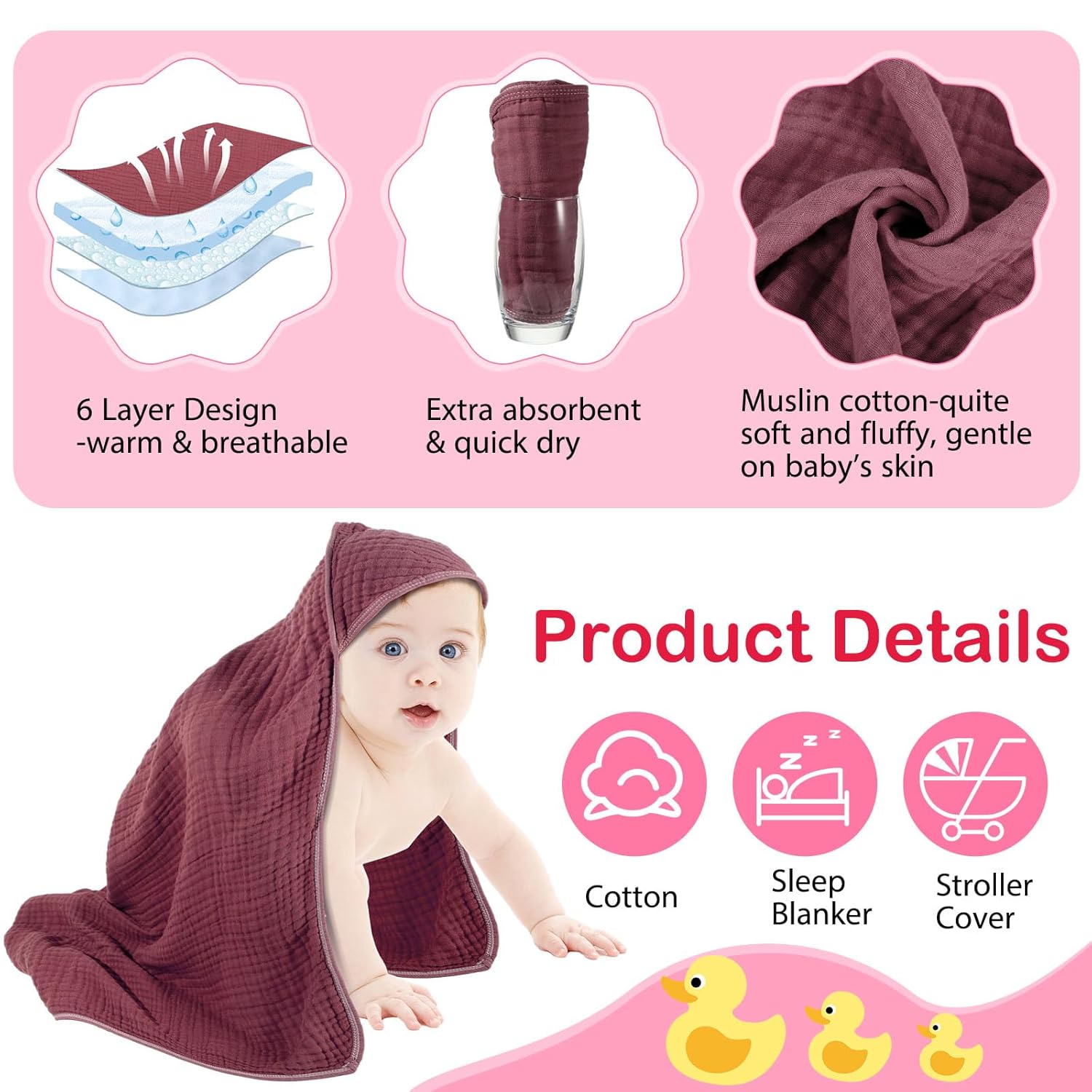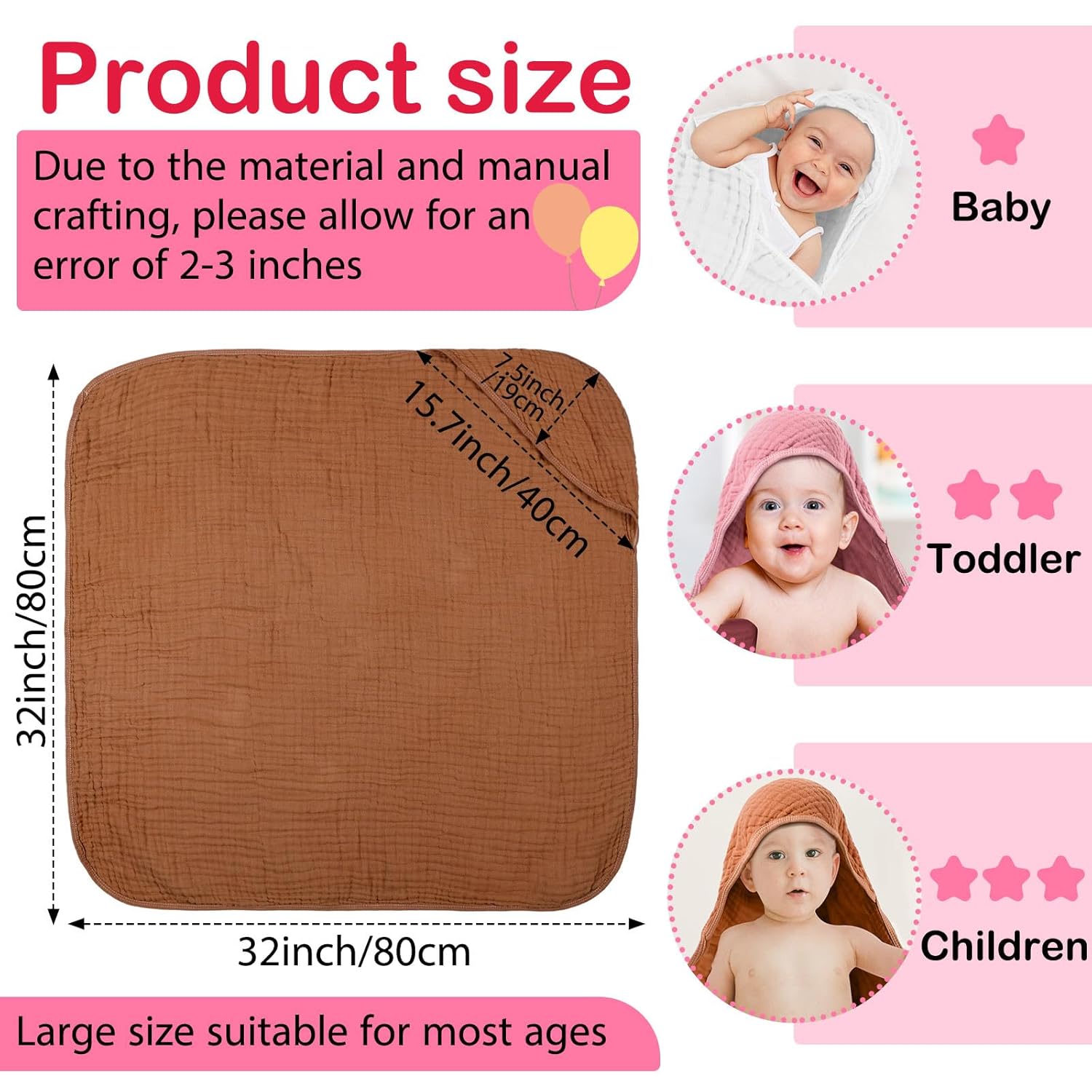 With six pieces in different colors, these towels provide endless versatility. Ideal for wrapping your baby after bath time, using as a cozy blanket for sleep or play, or even as a practical changing mat cover. The 32" x 32" size ensures complete coverage while allowing for easy handling, and the six-layer thickness helps absorb moisture quickly, keeping your baby dry and protected.