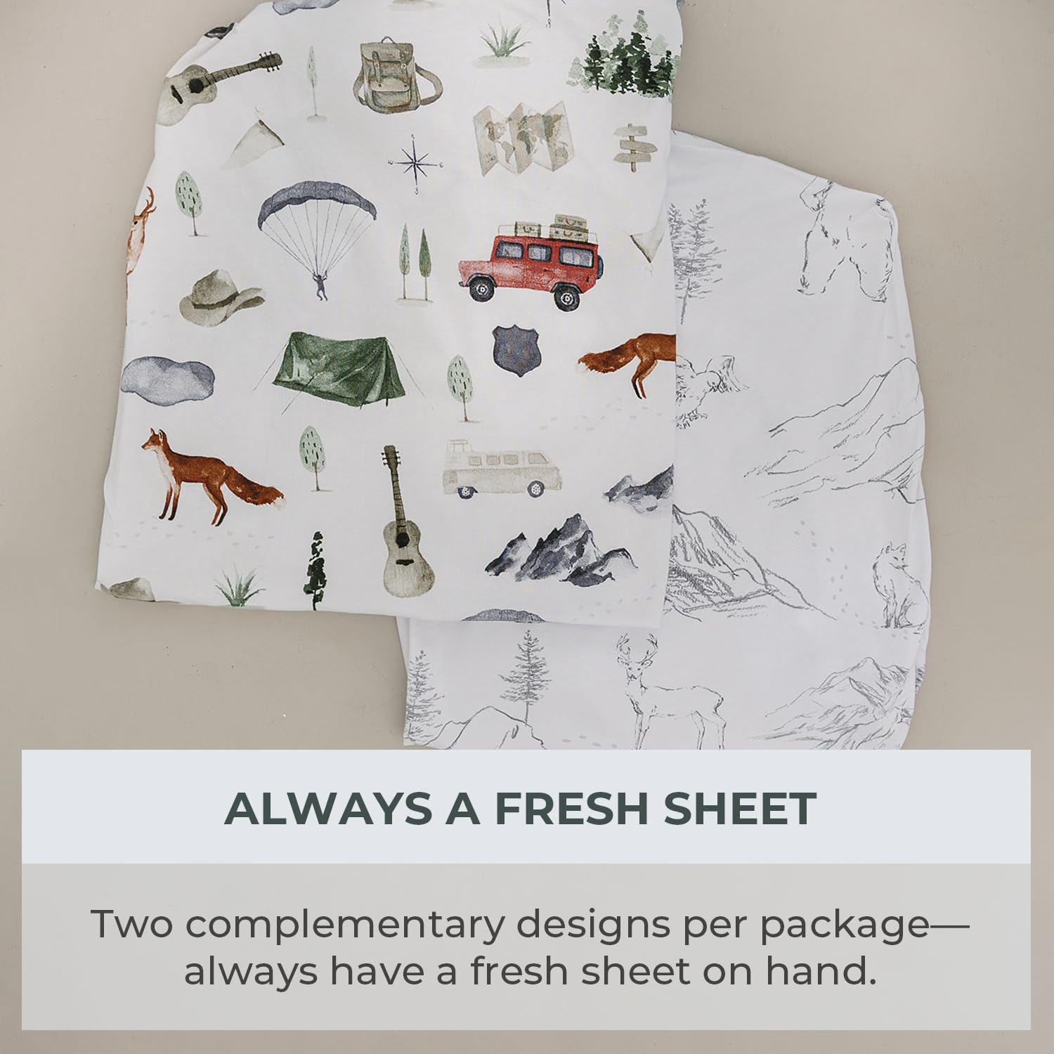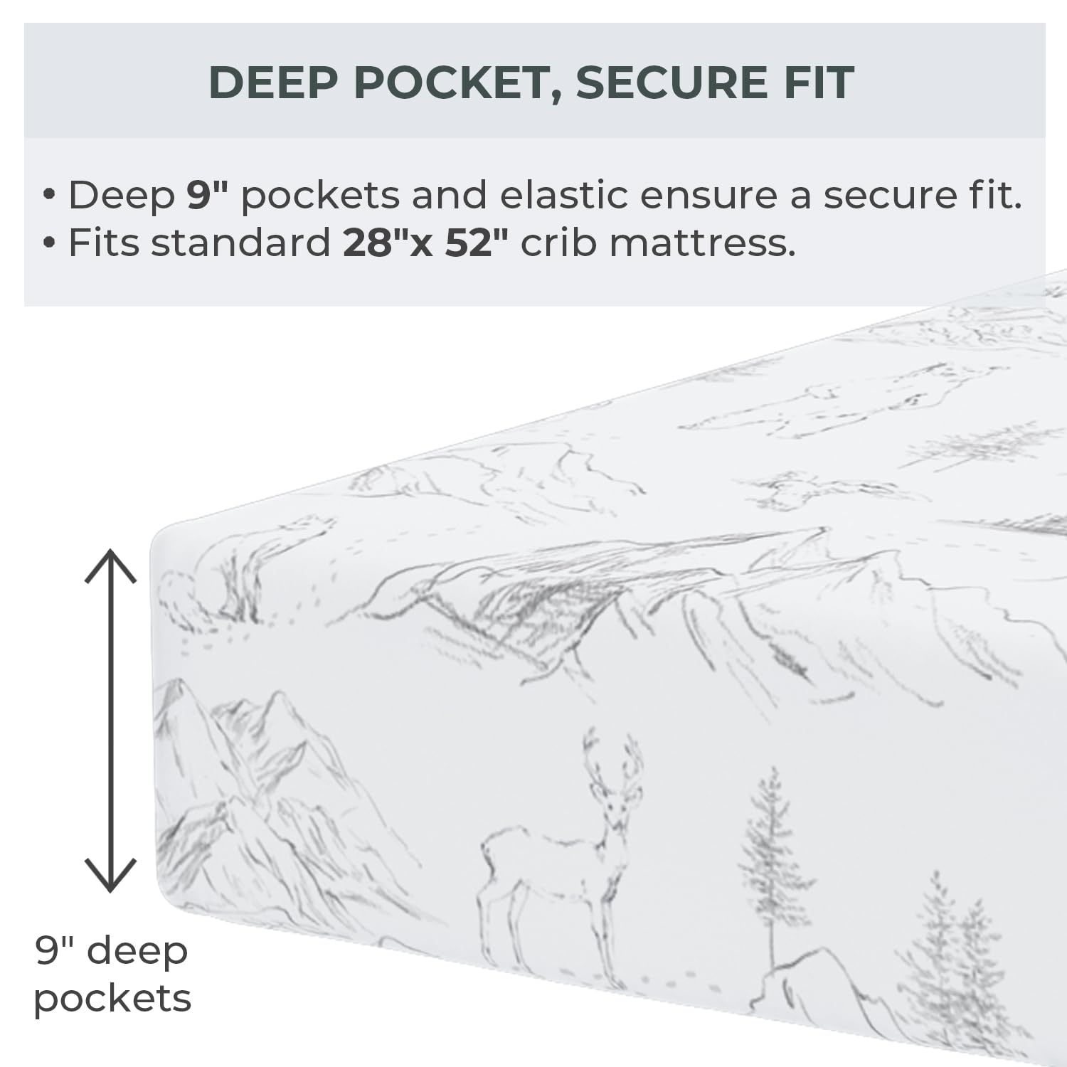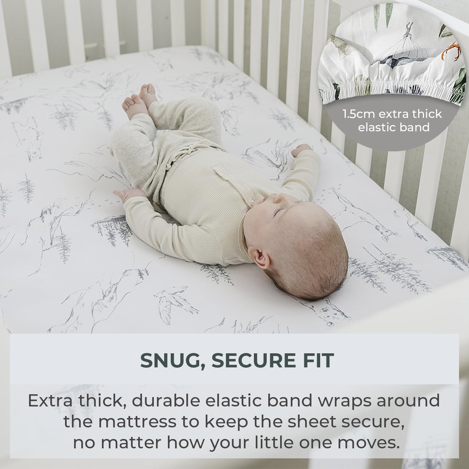 Each pack includes two beautifully designed crib sheets, featuring a charming woodland pattern that adds a touch of natural elegance to your babyâs room. The fully elastic band ensures a secure fit around the mattress, keeping your little one safe and snug throughout the night. This design promotes restful sleep and prevents accidents from slipping under the sheets.