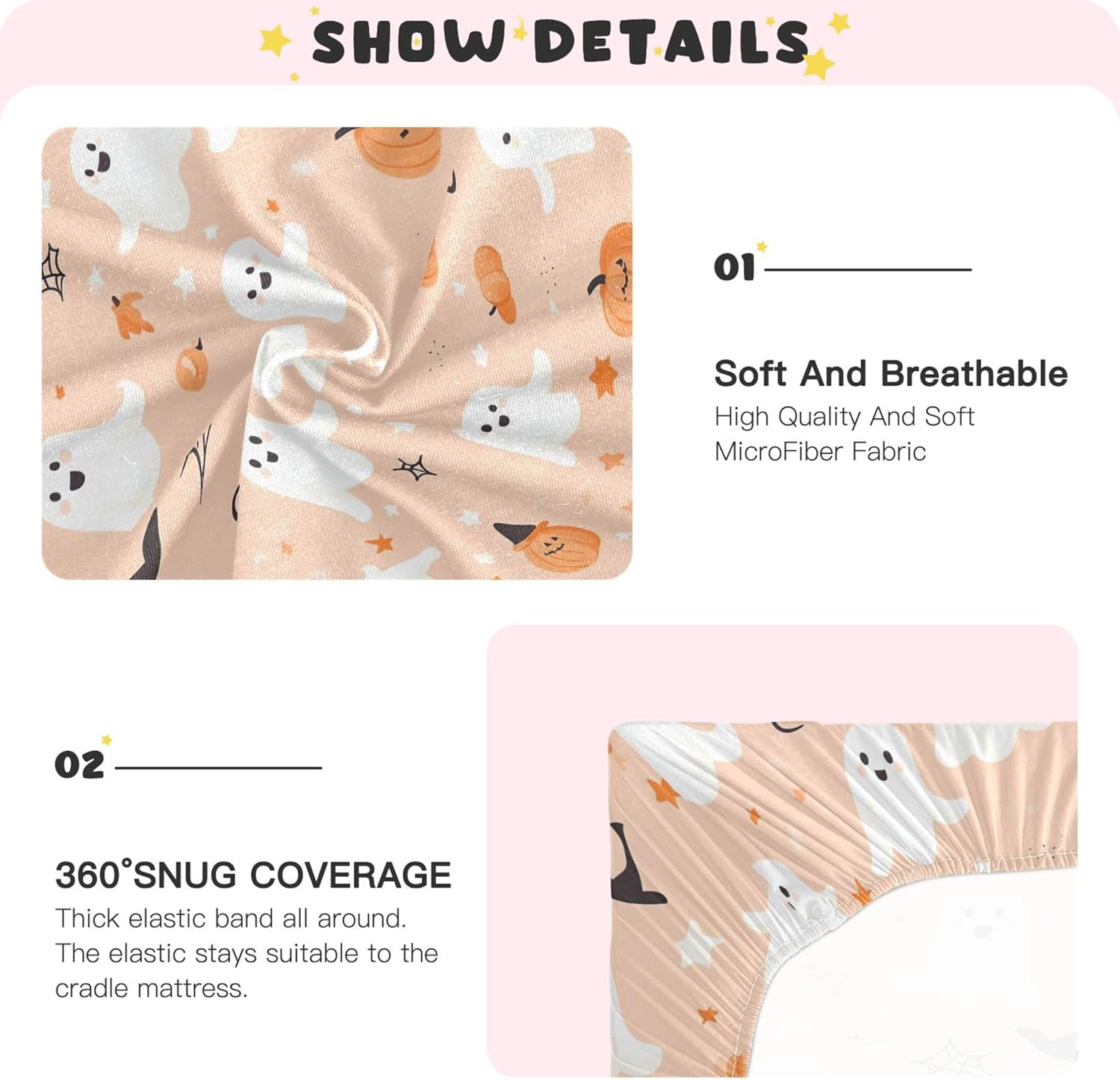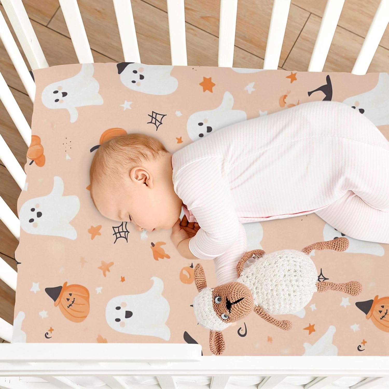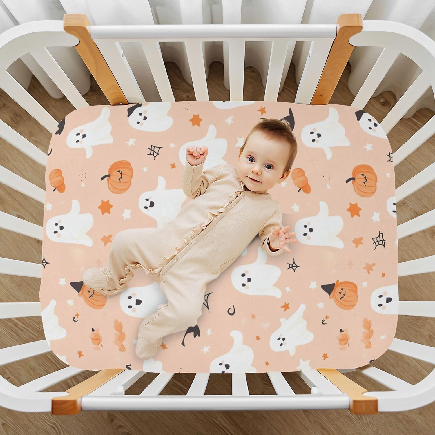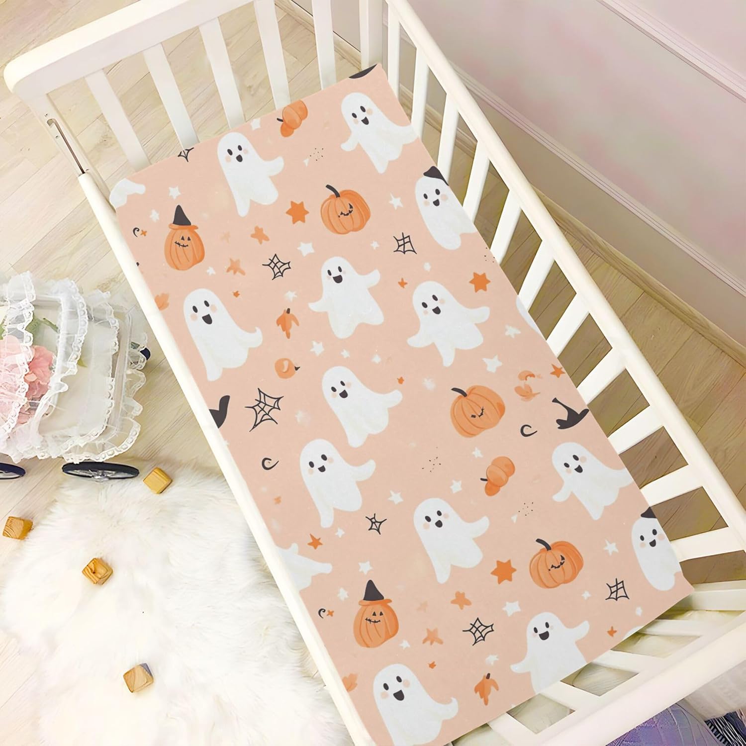 Qilmy crib sheet with ghosts and witches' hats design, made of soft modal fabric for sensitive skin. Perfect fit for standard and toddler beds, features elastic band and easy cleaning for lasting use.