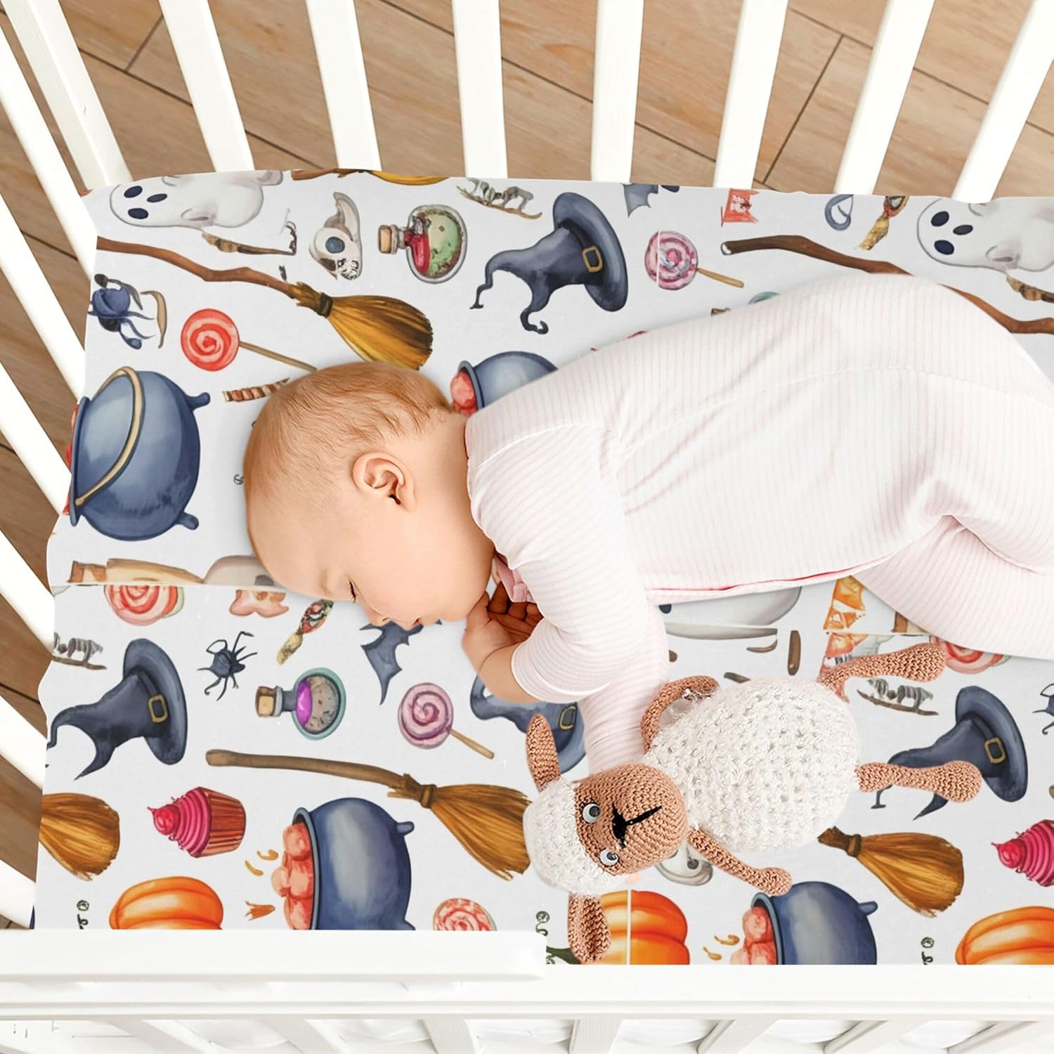With its breathable design and secure elastic band, this crib sheet keeps your baby safe and comfortable, even during sleep or play. It's an essential piece of baby bedding that combines style, functionality, and durability into one. Make your babyâs room feel extra festive with this Halloween-themed crib sheet thatâs built to last.