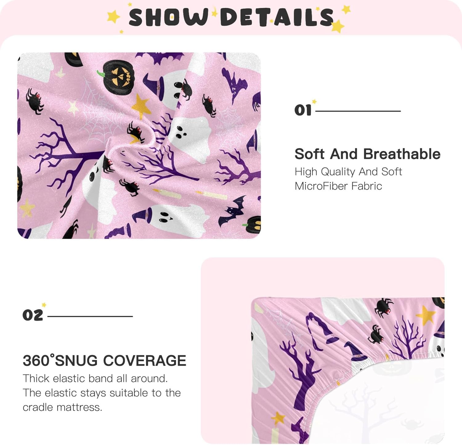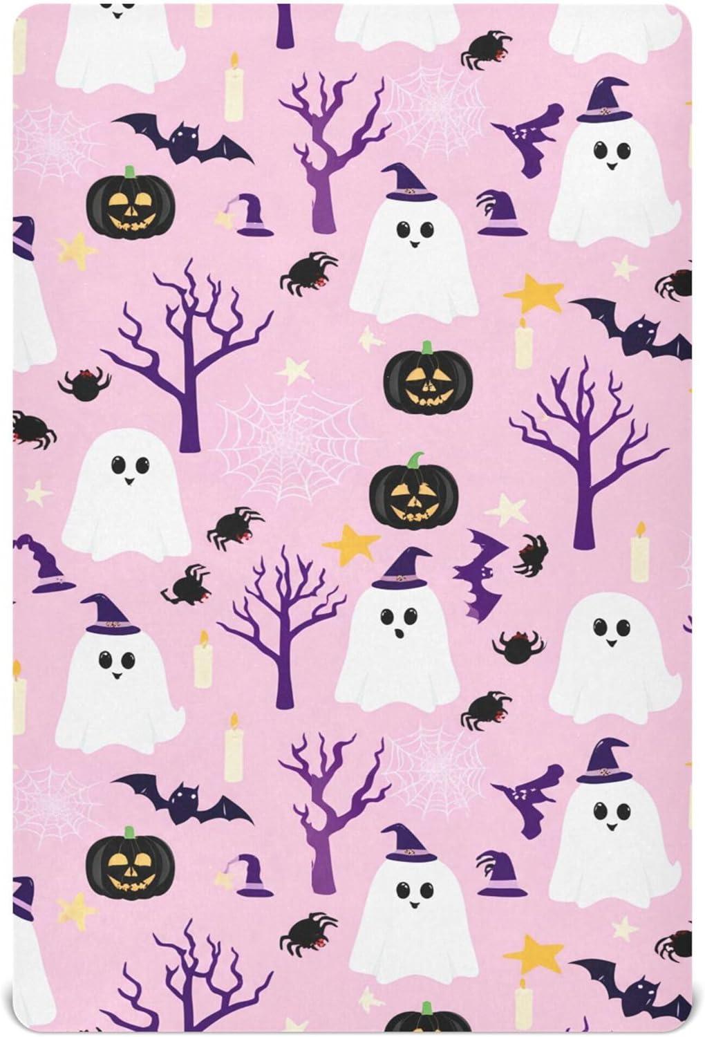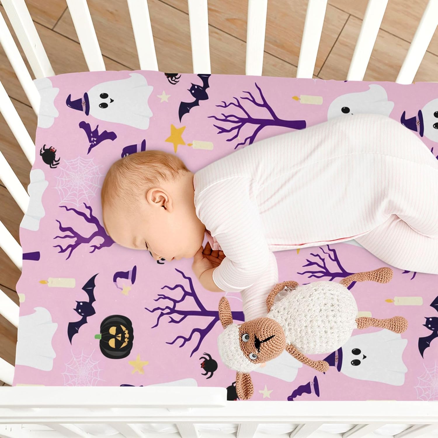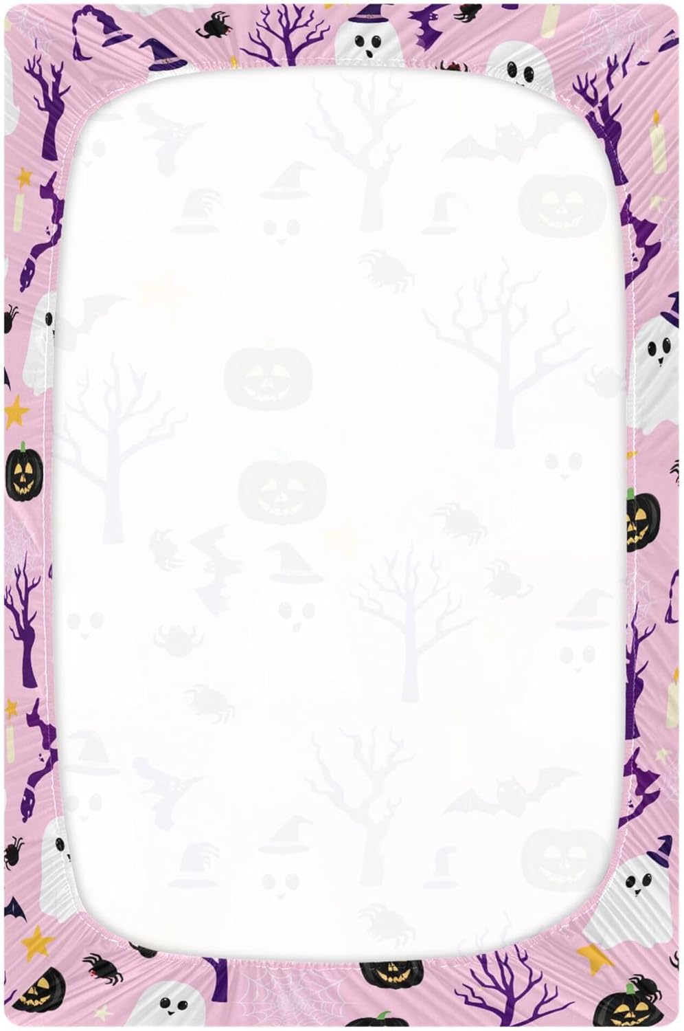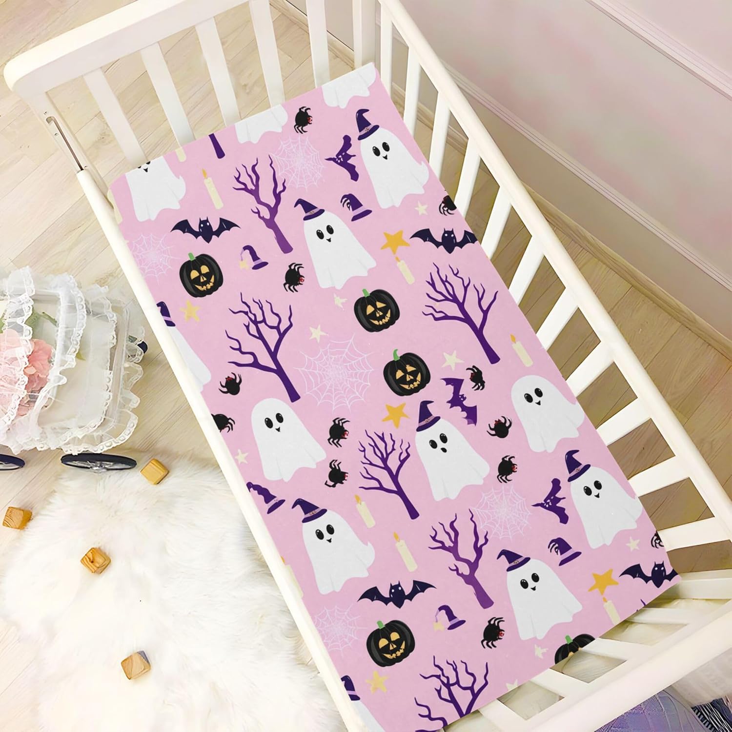 Add a touch of spooky fun to your babyâs room this Halloween with this stylish and functional fitted crib sheet from Qilmy. Crafted from a soft, skin-friendly blend of 95% polyester and 5% spandex, it ensures your little oneâs comfort while providing a gentle, irritation-free experience. The breathable fabric allows for all-day wear, making it ideal for both bedtime and playtime. With a deep pocket measuring between 5" to 9" and a secure elastic band around the bottom edge, this crib sheet keeps the mattress flat and creates a peaceful, safe sleeping environment.