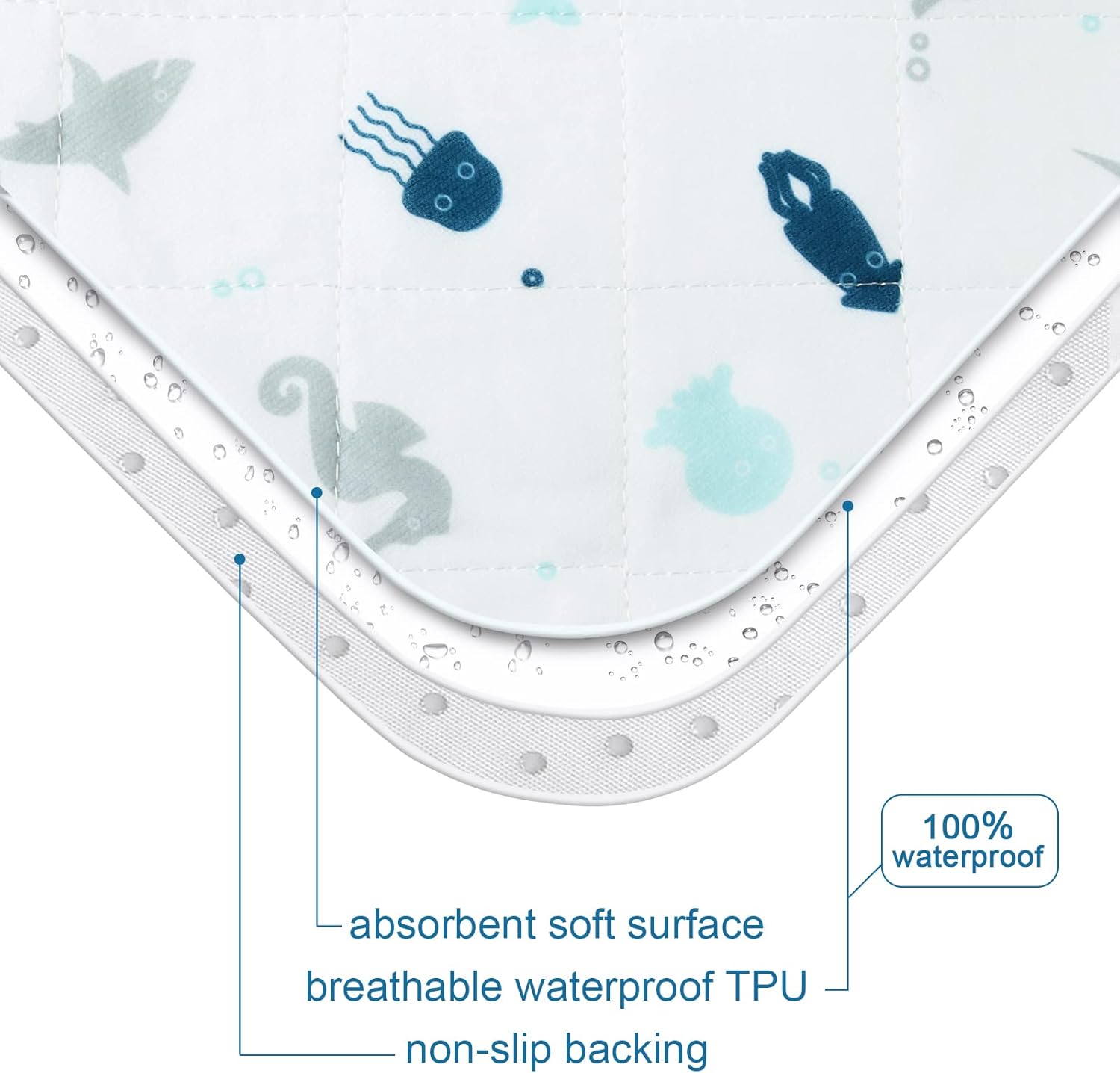 The combination of absorbent material, waterproof TPU layer, and non-slip backing ensures maximum comfort and protection. All pads are machine washable, so you can keep them fresh with every use. The cute blue ocean design brings a bit of nature-inspired fun to your little one's room, blendingå®ç¨æ§ with aesthetics.