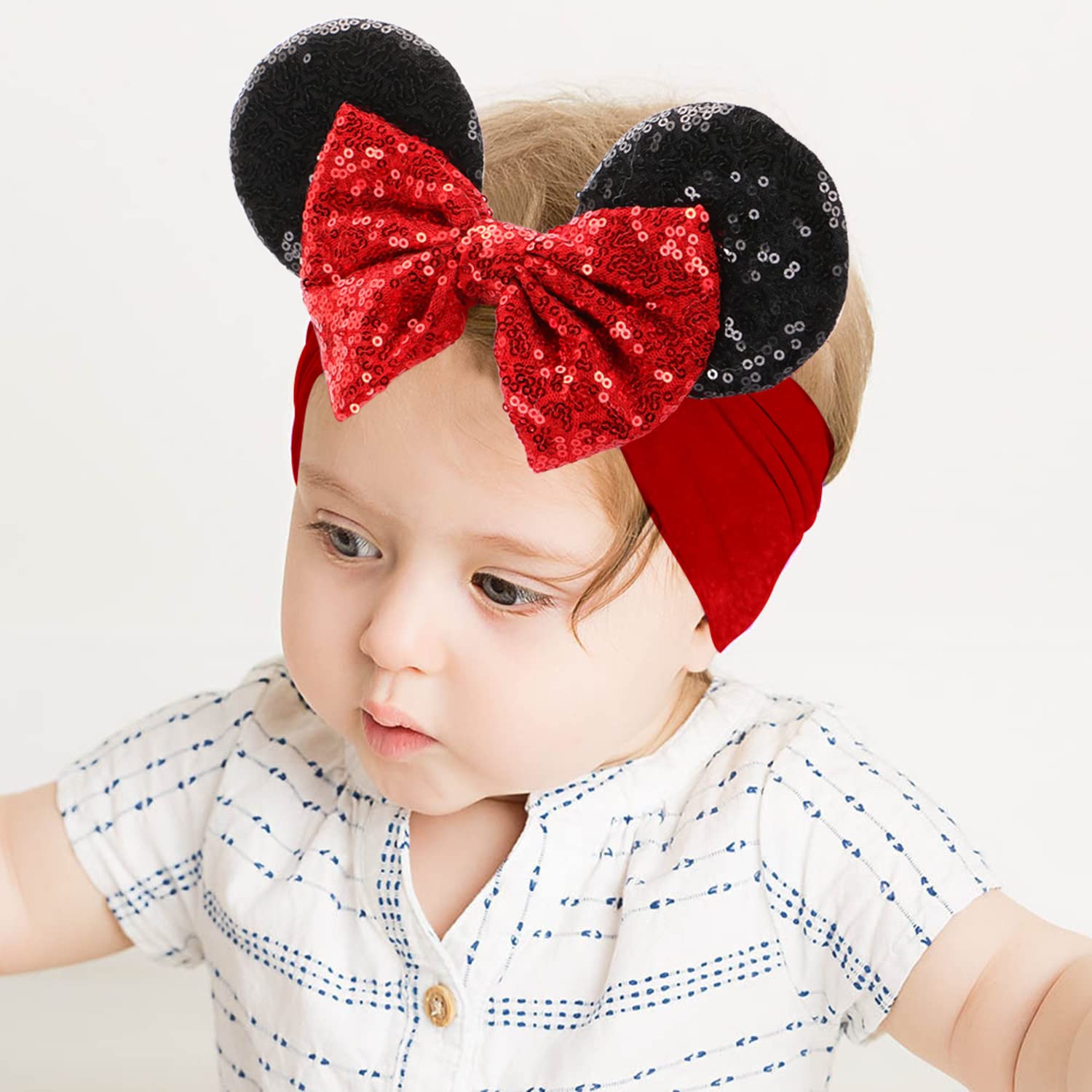 A soft and adjustable baby mouse ears headband crafted with high-quality bubble cloth. Designed to offer both comfort and style, it features a sparkling sequin bow that adds a touch of elegance and whimsy. Perfect for newborns and toddlers, this headband is sure to complement any outfit and bring joy to your little oneâs special days.