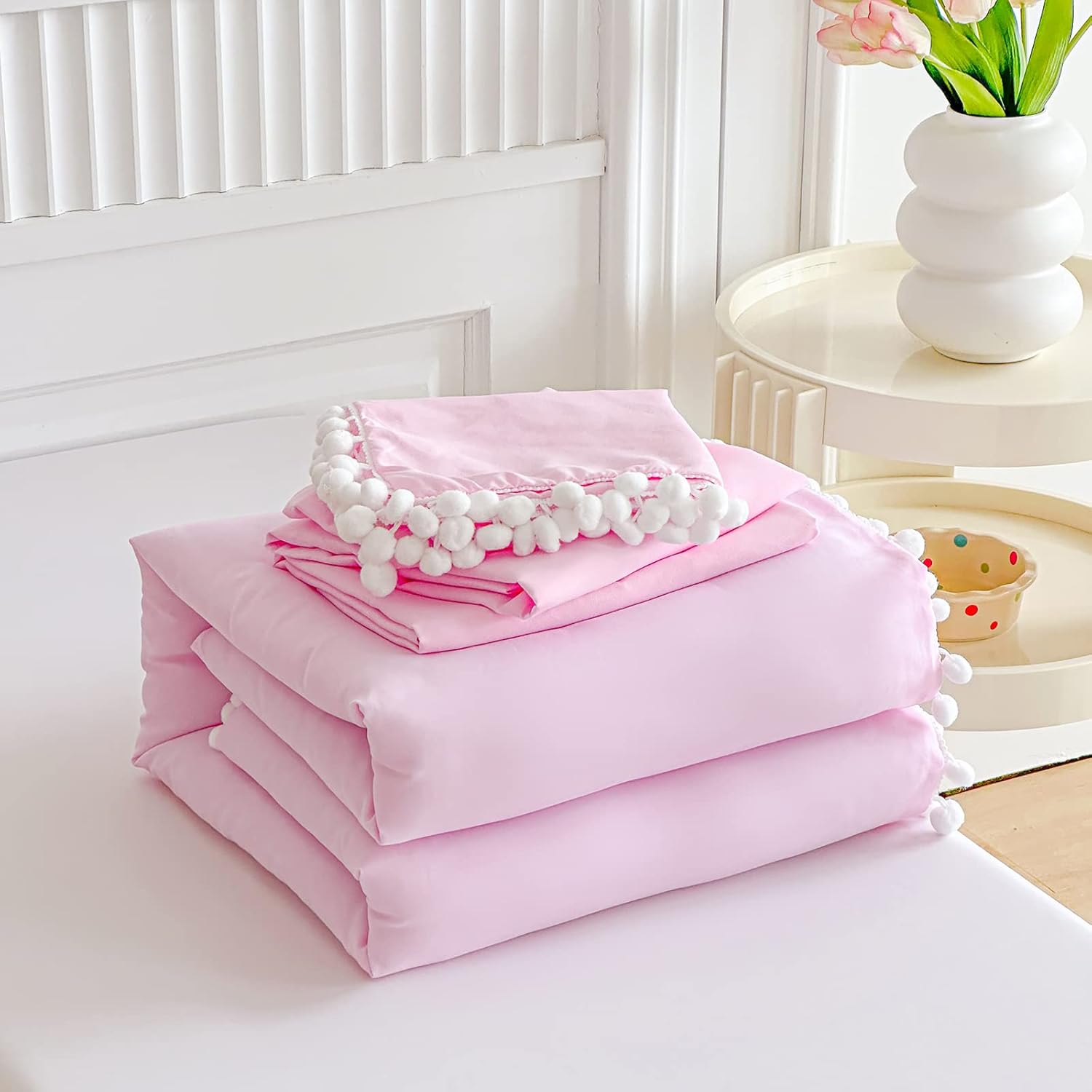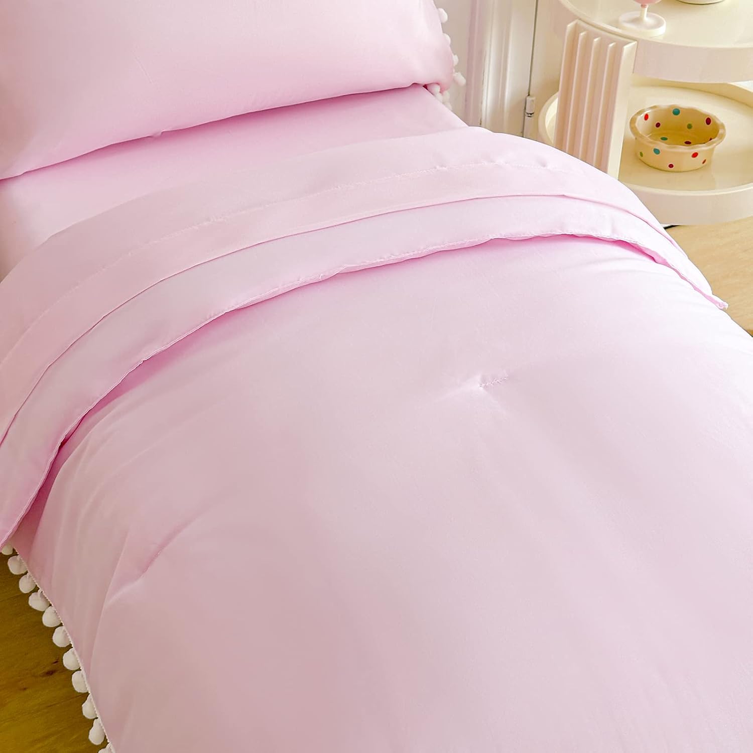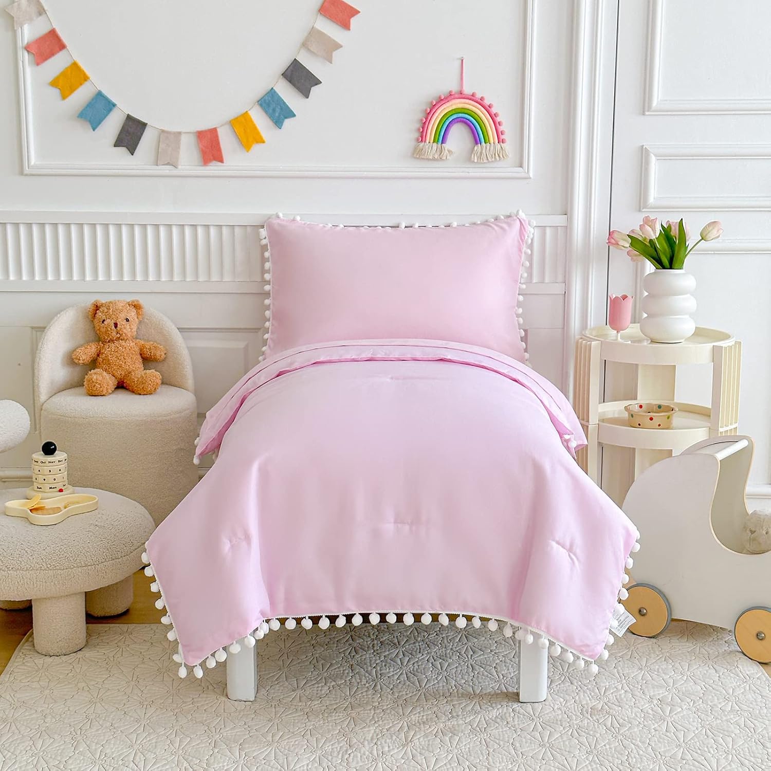 Transform your toddlerâs room into a charming and peaceful sleep space with the UOZZI BEDDING 4-piece toddler bedding set. Designed for comfort and style, this set includes a soft 100% microfiber comforter adorned with a striking 3.5-inch pom pom fringe, along with a reversible pillowcase and two matching sheets. The pastel pink hue adds a calming touch, while the boho-inspired design brings a fresh, artistic vibe to any nursery.