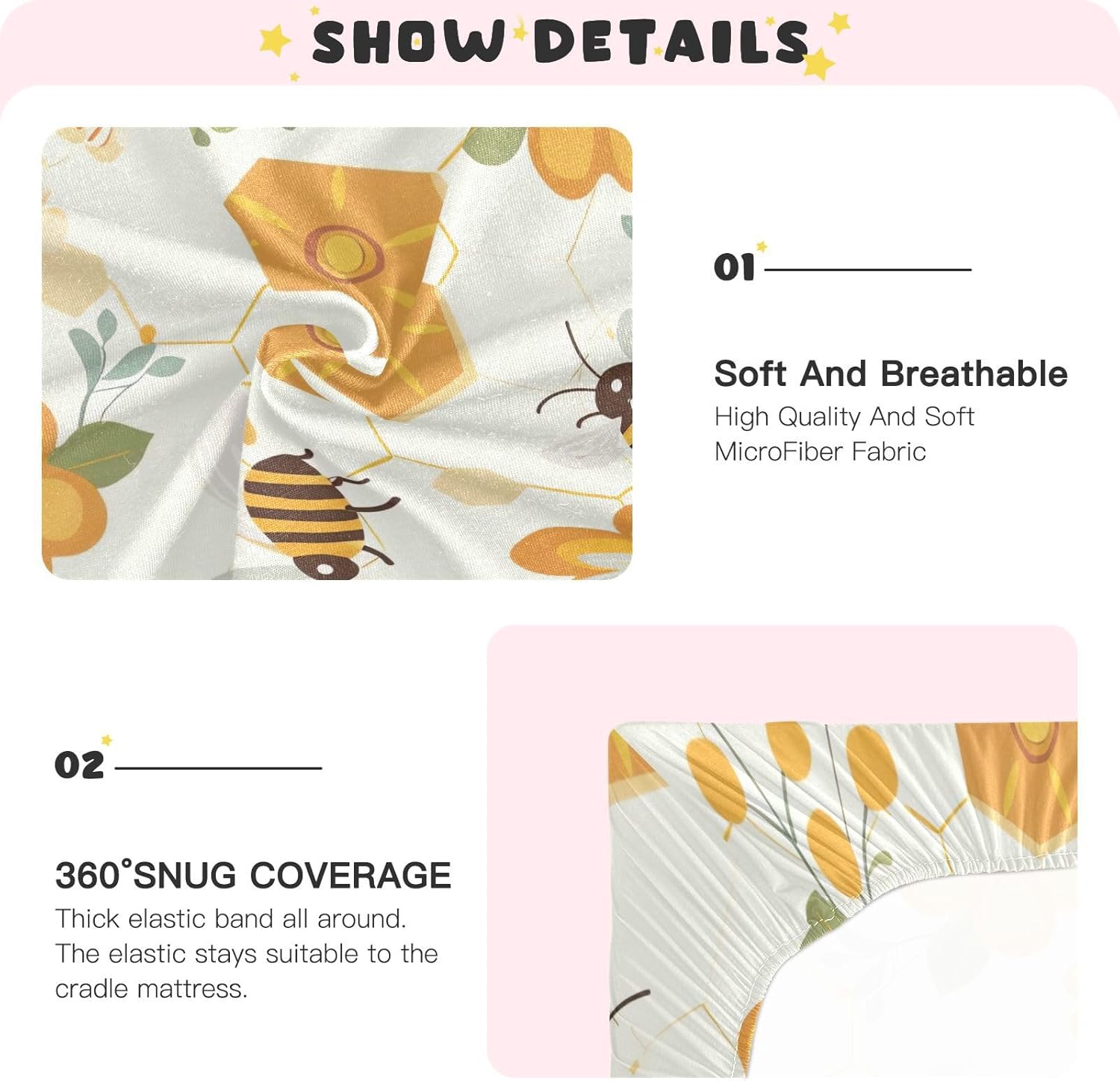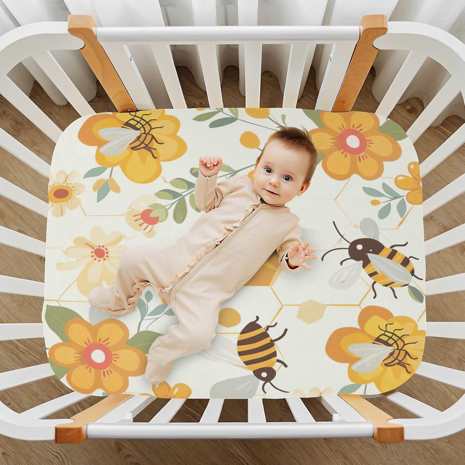 These Wajiw Bees Crib Sheets are crafted to give your baby the best sleep experience possible. With a secure elastic bandage around the edges, they fit snugly over standard and toddler mattresses, eliminating the need for additional fasteners. The ultra-soft microfiber material ensures a comfortable, gentle touch for your babyâs sensitive skin, while the breathable design helps keep the nursery cool during warmer weather. Durable and easy to care for, they are the perfect choice for any parent looking for both style and practicality.