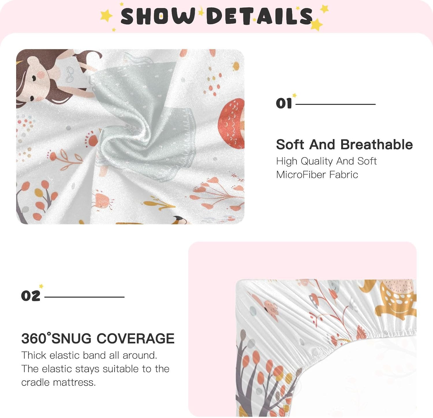 Exquisite, colorful patterns bring charm and a sense of fantasy to your babyâs room. These sheets are breathable, keeping your little one cool and comfortable during the hottest days. The design adds a magical atmosphere to every sleep time.