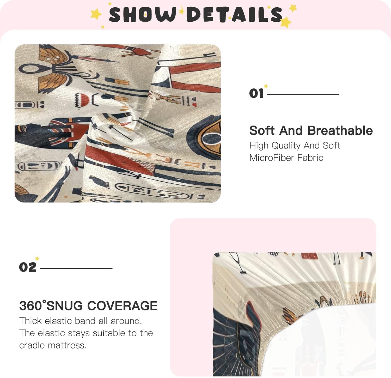 Our Wajiw Egyptian Figures Crib Sheets are crafted from ultra-soft microfiber that's gentle on your baby's skin and also highly durable. The breathable fabric ensures a cool and fresh sleeping environment, helping your little one stay comfortable throughout the day and night.