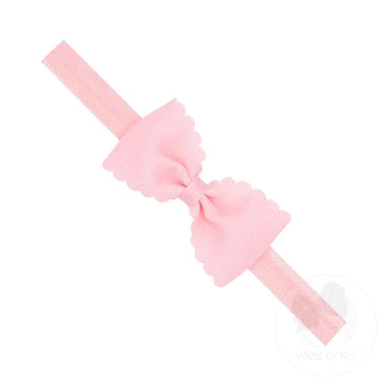 This adorable baby bowtie is a perfect blend of style and comfort, crafted especially for little girls between 6 to 24 months. Made from soft grosgrain fabric, it is gentle on sensitive skin and provides a secure fit with an elastic band. The scalloped edge adds a playful and whimsical look, while the light pink shade offers a subtle yet eye-catching pop to any baby outfit. Ideal for everyday wear or special occasions like baby showers, this bowtie is a great addition to any babyâs ensemble. Whether for a family photo session or a casual playgroup, it adds a charming finishing touch without compromising on safety or ease of use.