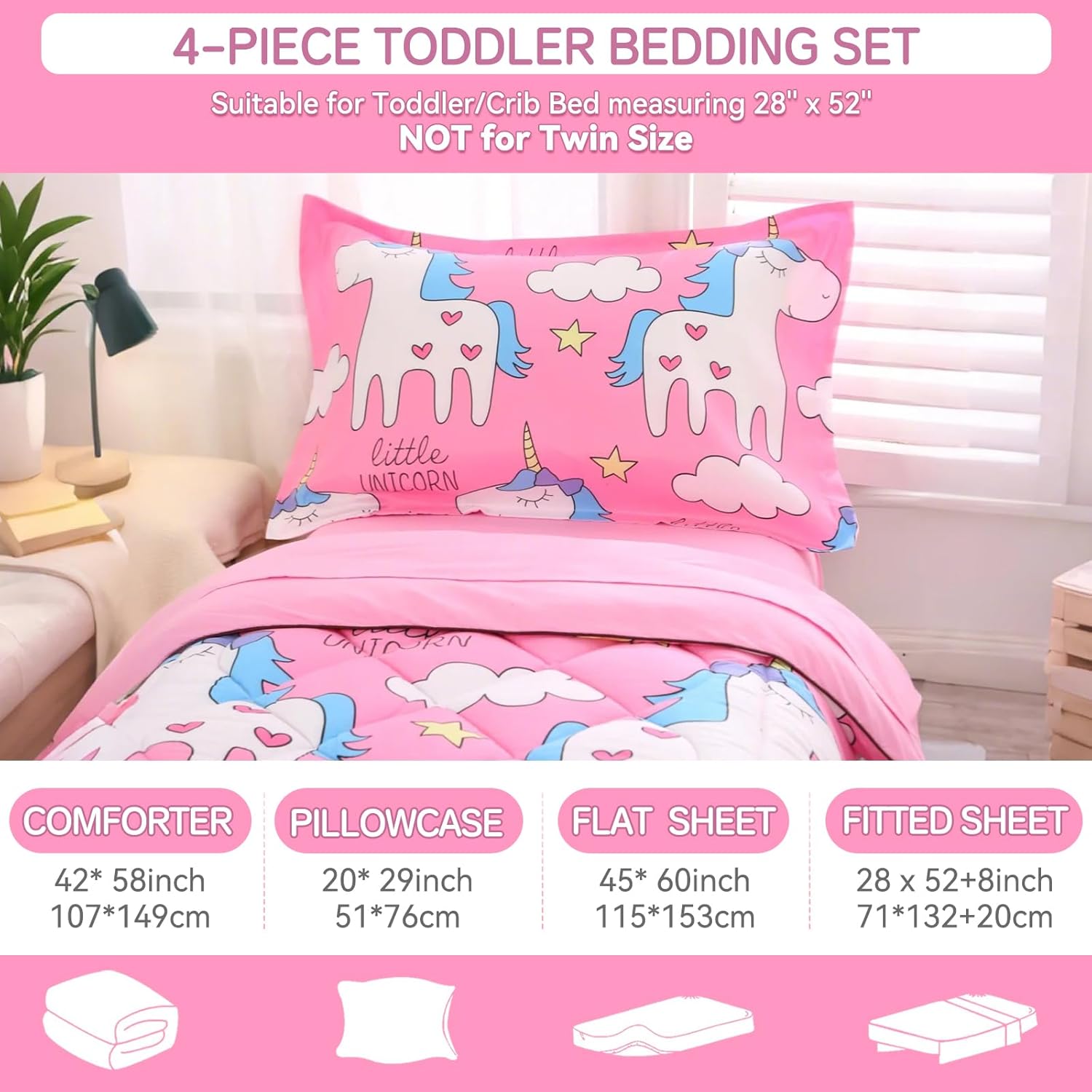 ideal for both new nursery setups and room updates, this 4-piece collection includes a 42''x58'' comforter, 45''x60'' flat sheet, 28''x52'' fitted sheet, and 20''x29'' pillowcase. Itâs more than a bedtime setupâitâs a colorful and cozy space your toddler will adore.